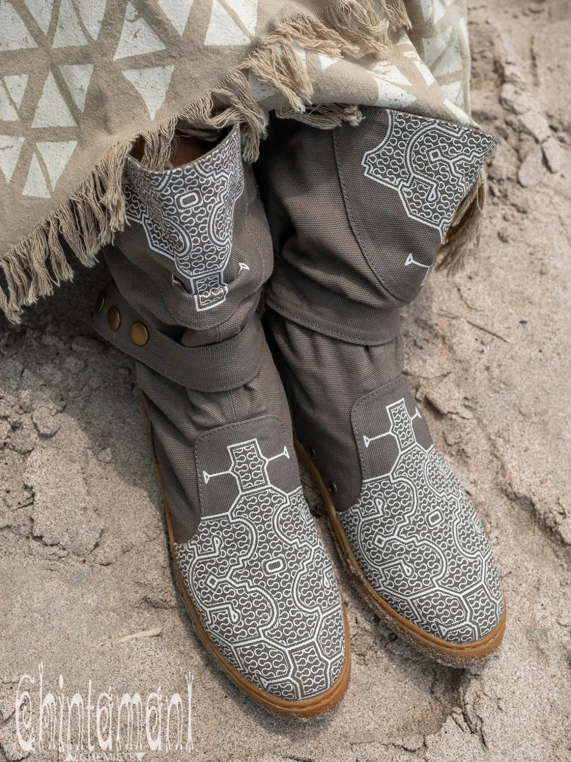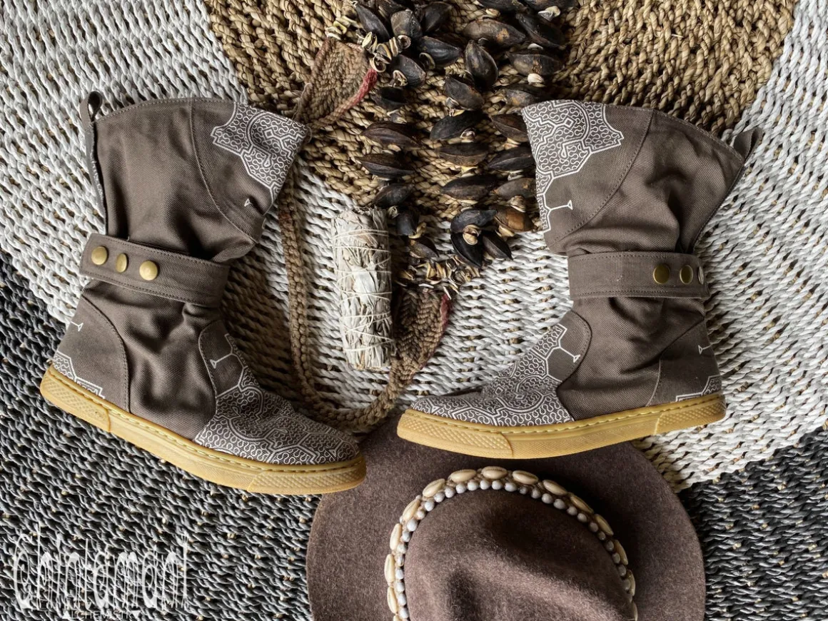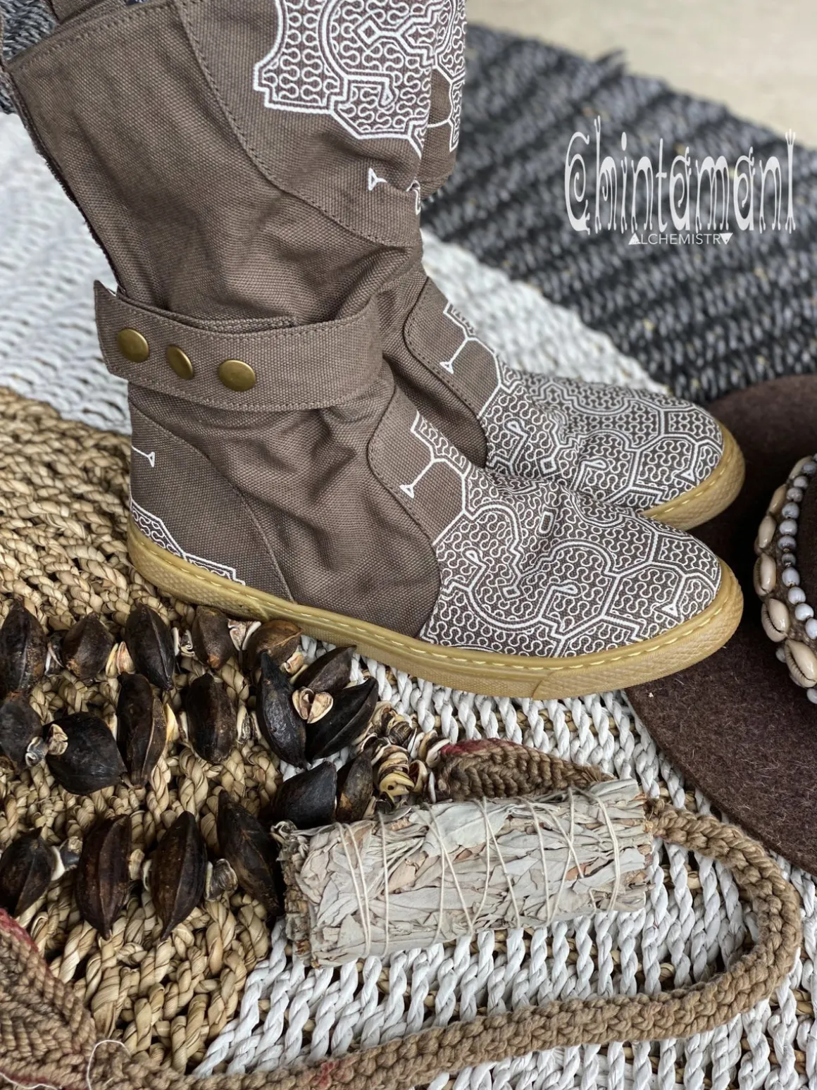 Full Vegan bohemian high shoes made of 100% cotton canvas. These elegant boots will suit a traveler, a dreamer or a city dweller, who likes natural feel and comfort. They complement any leg shape and can be worn either with pants, skirts or dresses. Wearing stunning Chintamani Alchemistry shoes, one doesn’t have to compromise between amazing boho chic look and ability to walk for miles and dance for hours. Flat, comfortable sole is stitched all around so it will last for years of continuous use. All our boots are decorated with sacred patterns. Two Solid Brass Chintamani feather pendants go together with each pair.