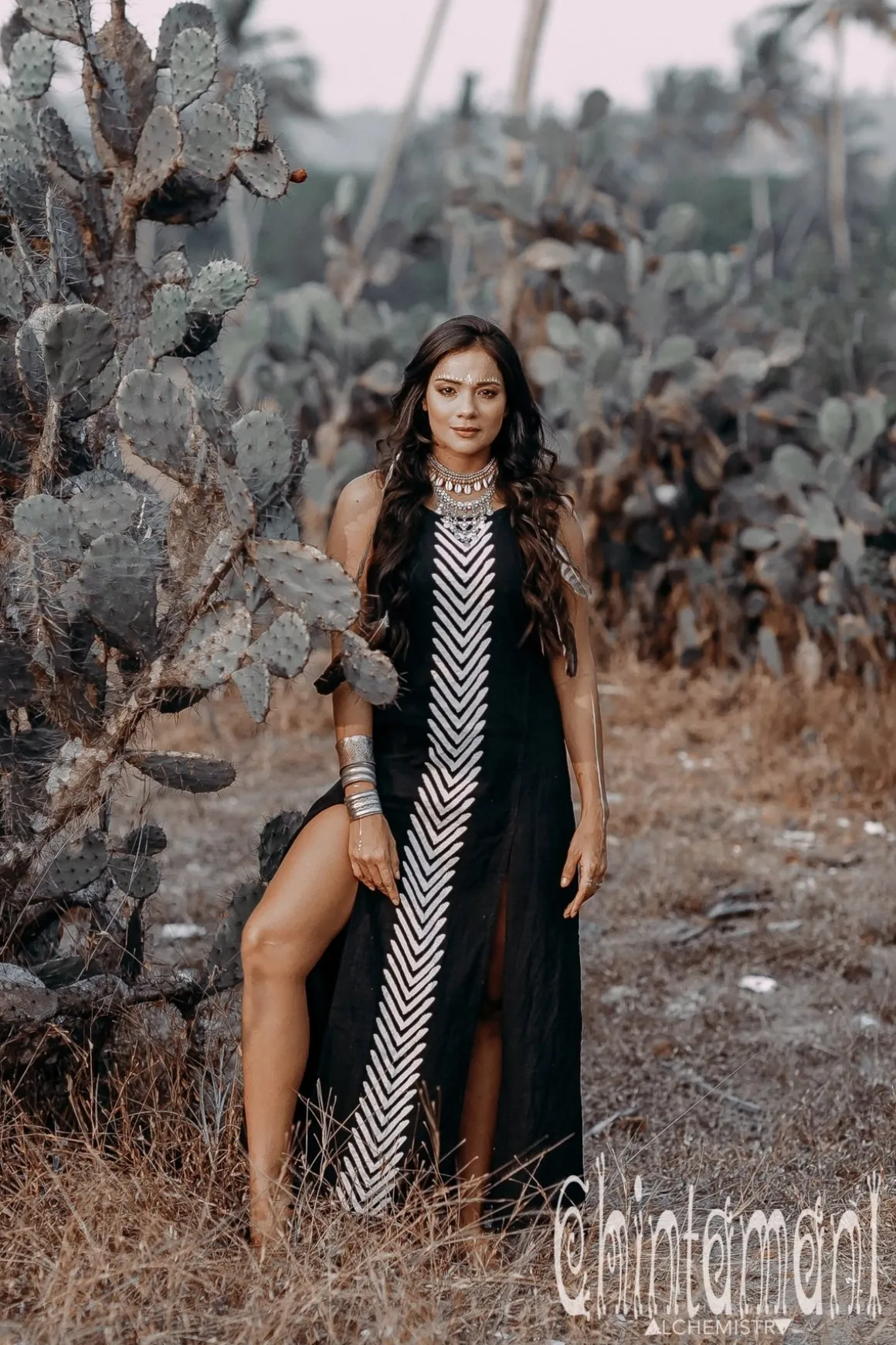 Corners Print Long Maxi Dress is a stunning stand alone artefact from our Organic Cotton Collection. We made the choice of using certified organic fabric as a conscious step towards a cleaner, more fair and beautiful world. The textile we use for this piece is strong and gorgeously textured pure cotton, breathable and durable. It is dyed in classic black color, and also comes in its raw silver grey version. The silhouette of this dress is simple and sleek – but with an amazing detail: there are four slits, two in front and two on the back, that show off your legs when you move or dance in a sensual but elegant manner. Paired with our oriental Kimonos it can become a graceful gown for an artsy occasion, just by itself – it is that perfect light and comfortable dress for an Ecstatic Dance session. The front and back of the piece are decorated with subtle geometric print, to add a little tribal detail. This is a more classy version of a similar Organic Cotton Alchemy Dress, that is available in more vibrant colors (Turquoise, Gray and Coral).