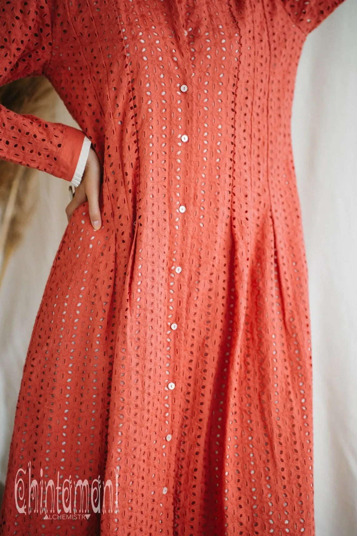 This sophisticated darted maxi dress is a jewel of our broderie anglaise collection! It is traditional European embroidery with eyelets, that was very popular in Victorian Britain. Airy whitework (white embroidery on white) made on certified organic cotton inspired the whole set of romantic and elegant dresses. The fabrics is decorated with six petals flower eyelets, that remind of Chintamani main symbol – the Flower of Life. Meanwhile thin organic cotton white lining makes it non transparent. Classy silhouette with buttons in front is so easy to wear! It doesn’t crinkle and keeps the shape without any effort. Add our canvas vest or soft fluffy shawl – and you are perfectly layered for spring breezy weather. You can get this dress in creamy white, latte beige and rusty red colors.