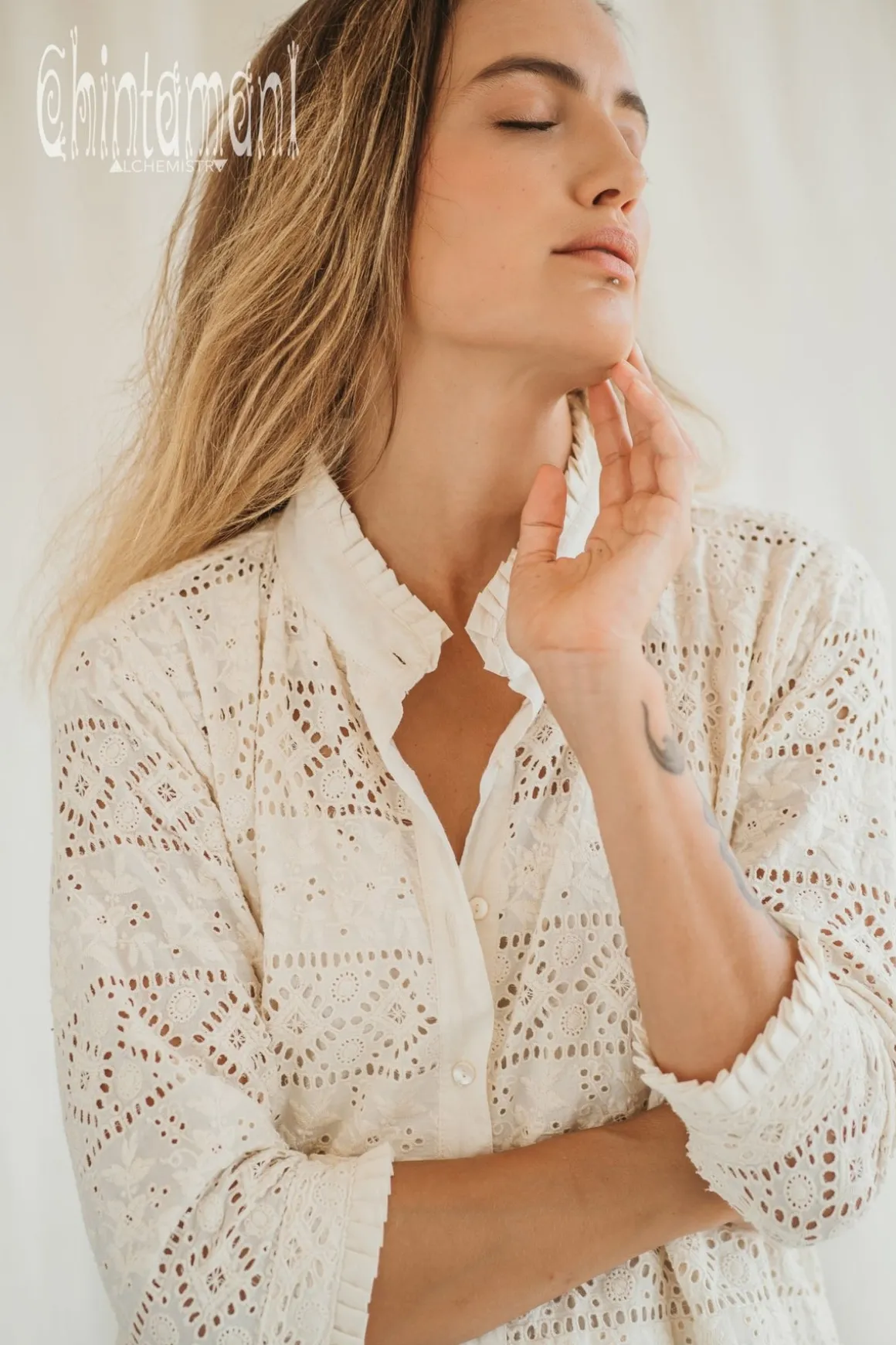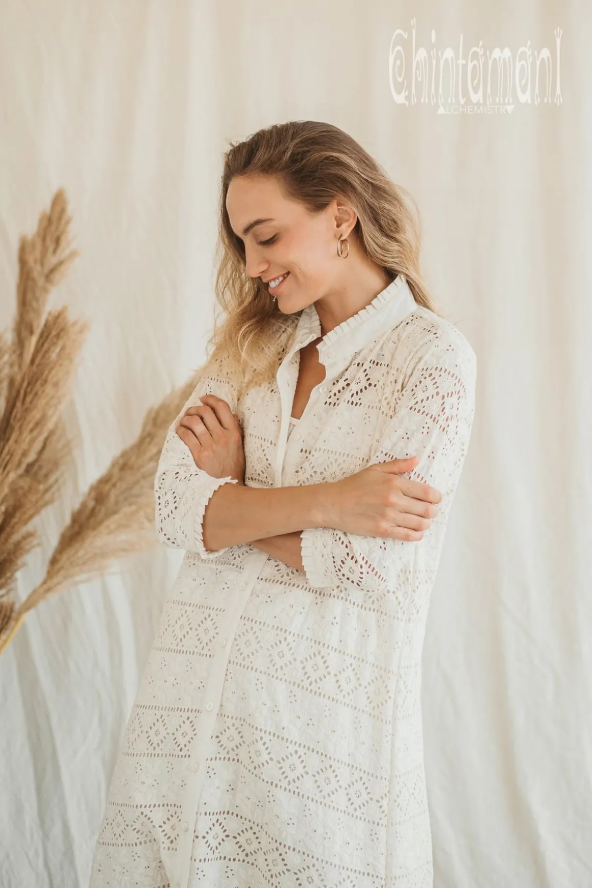 Our new broderie anglaise collection is here! It is traditional European embroidery with eyelets, that was very popular in Victorian Britain. Airy whitework (white embroidery on white) made on certified organic cotton inspired the whole set of romantic and elegant dresses. This shirt dress with creamy white underlayer is one of them. The base is a long simple sleeveless maxi-dress with round neck cut made of the softest cotton. It is semi transparent and can be a perfect base layer for our asymmetric dresses, that are short in front and long in the back – turning them into stunning layered gowns. Second layer is a gorgeous 34 sleeved broderie anglaise shirt dress with gently ruffled cuffs and collar decoration. You can wear second layer separately as cardigan, or put together this simply gorgeous ensemble for ultimately feminine French countryside look. We are picturing morning coffee in Provence with a lavender field view! Dress comes in creamy white, latte beige and rusty red colors.