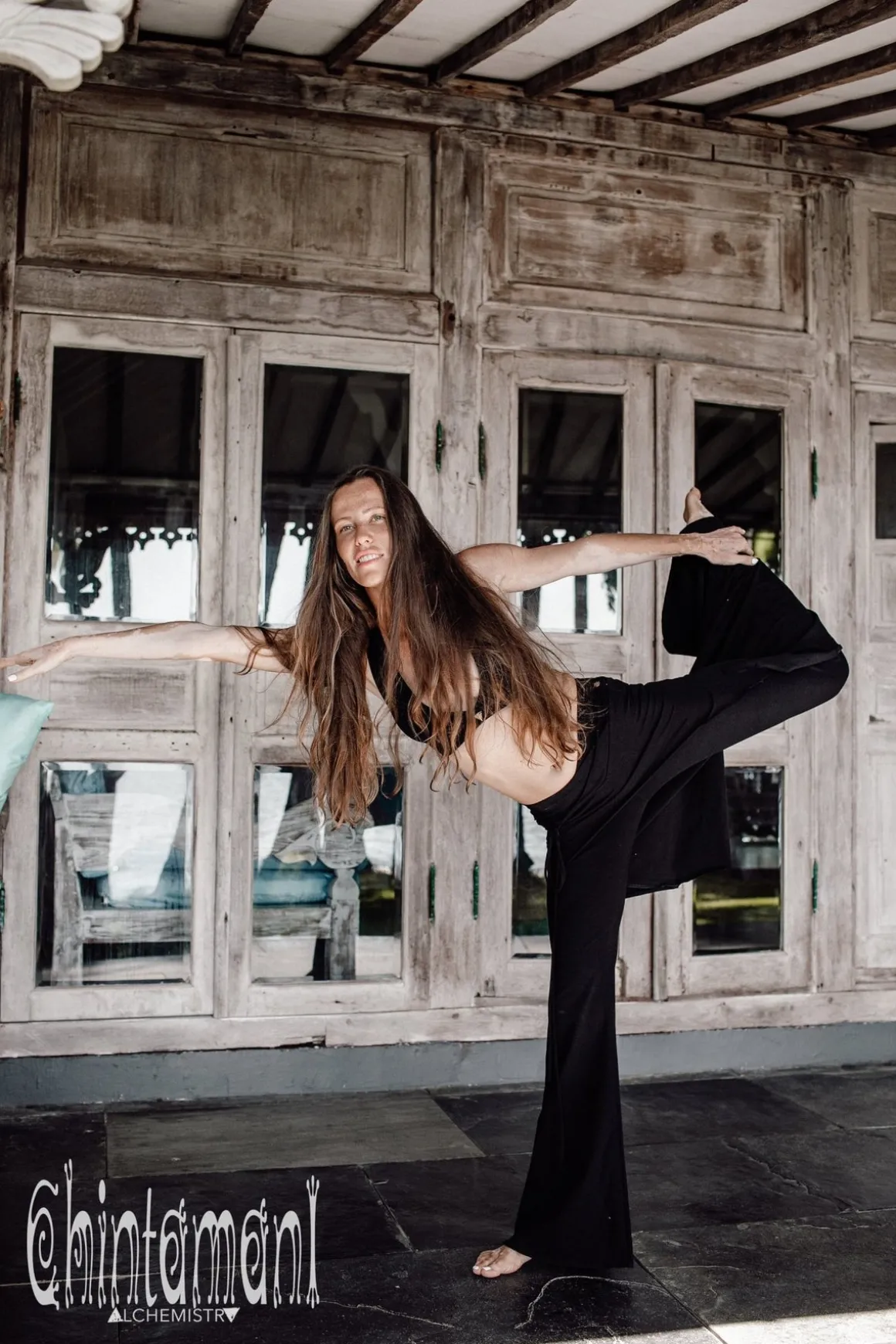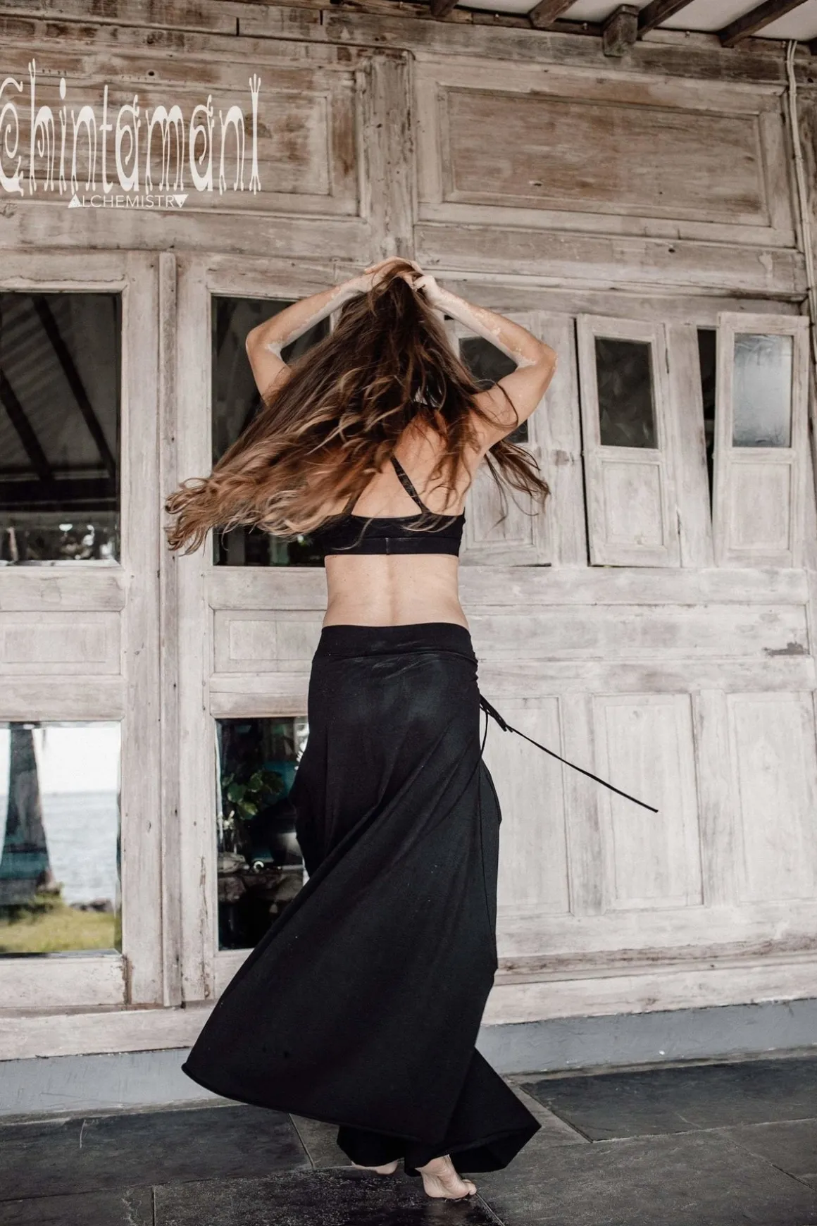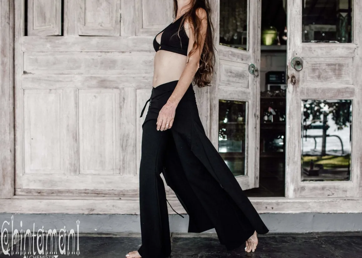 Our Black Skirt Pants is a comfortable, but very graceful piece, perfect for travelling in style. The convenience of stretchy flare pants is combined with floaty boho elegance of long trail to create original and useful artefact. The garment is made of best quality tight stretch cotton (92% cotton, 8% lycra). The silhouette is very low fit. Combines nicely with our raw cotton tops for artsy smart casual look, or can be worn with plain stretchy t-shirt for sport casual twist. Make up a stunning ensemble with our long vests and coats – this way Skirt Pants are perfect option for colder season. Made in Love in Bali.