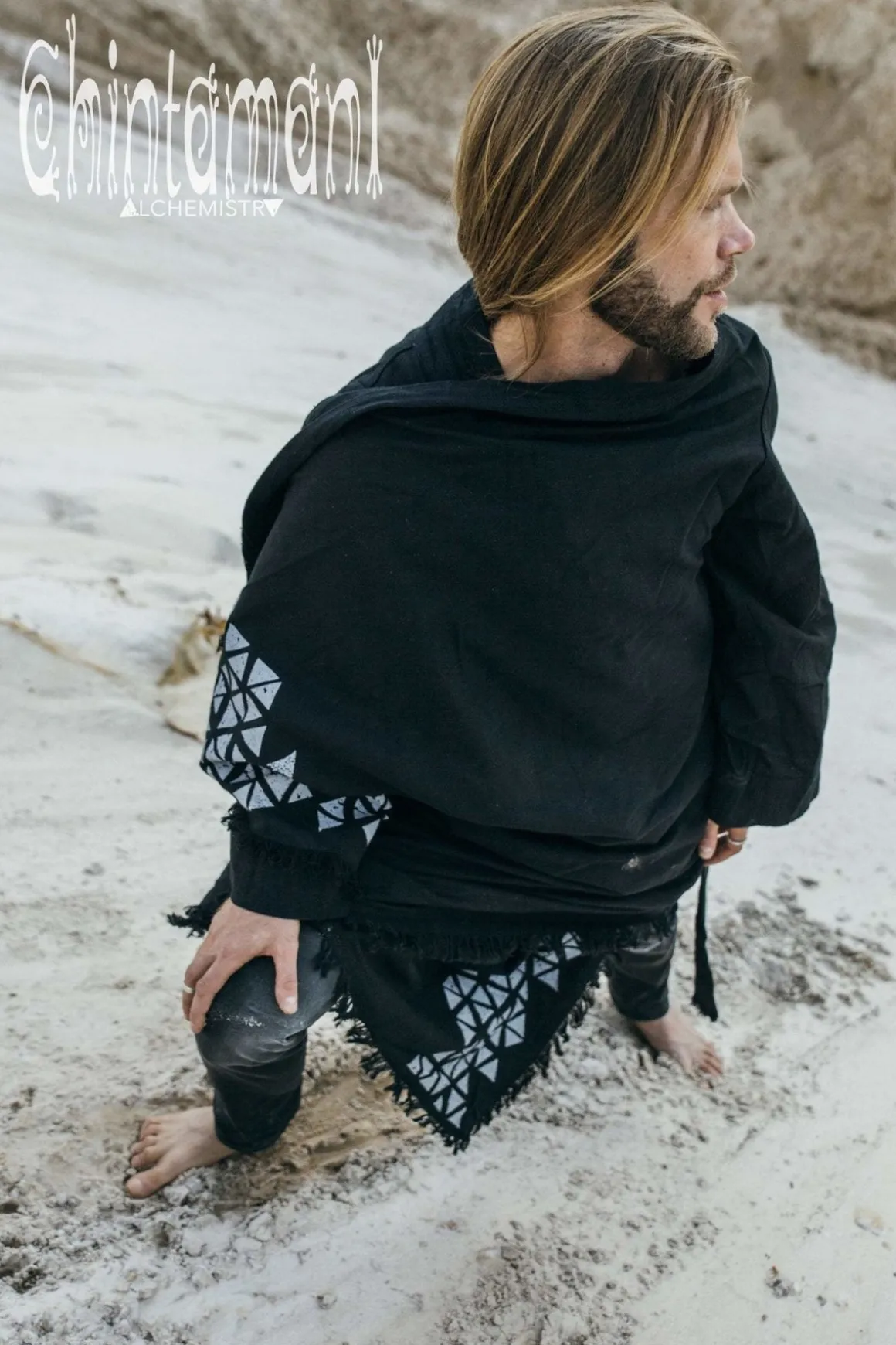 Black Cotton Kimono Wrap Mantle is a bohemian masterpiece for dreamers and wonderers, something to create instant festival look. It is a free size piece, that you can wrap around and fix with the belt in so many creative ways, as well, as just wear open as a gorgeous floaty mantle. The gown is made of 100% cotton, that has amazing raw structure. It is also decorated with screen printed geometric patterns and fringes to finish off boho look. In fact this unique piece is quite multifunctional: it can be a festival overall, ethnic bathrobe or creative designer outfit for concerts and spiritual seminars. The Kimono Wrap comes in 2 classic colors – white and black, both perfectly combine with soft Chintamani Alchemistry Linen pants.