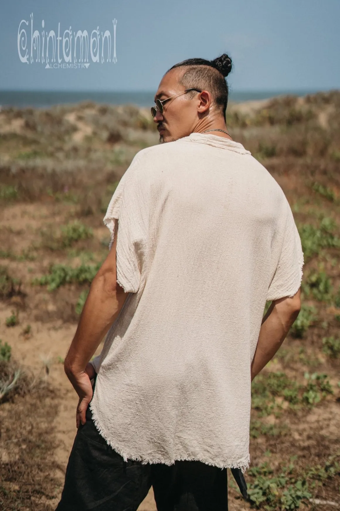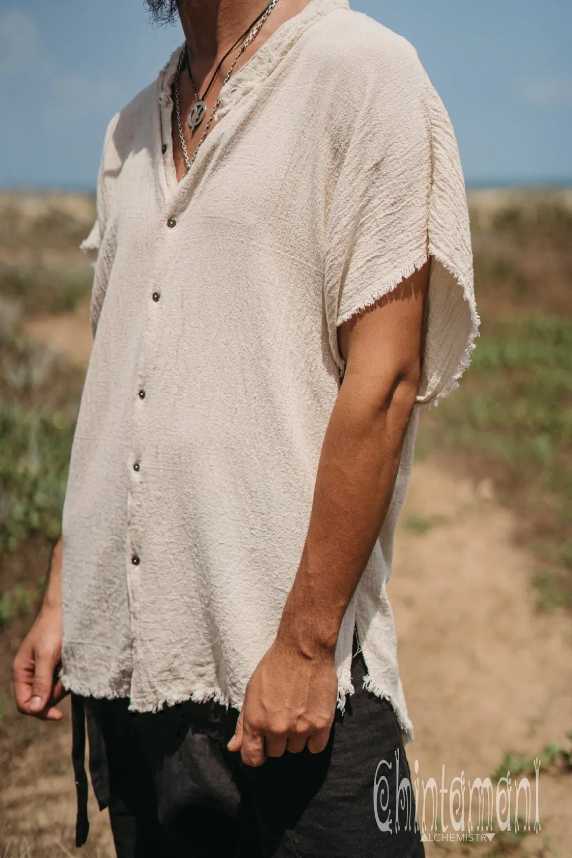 The summer is here – and so is very simple, artistic and light Men Organic Cotton Button Shirt from Chintamani Alchemistry. Wide but short sleeves is something very different from mainstream, and gives the model a designer twist. Other than original sleeves, it is just a classic shirt made of very soft natural material, that is very pleasant to wear. Open hemline is traditional for our brand and adds a bit of rustic carelessness to the item. Goes good with long linen pants, shorts, jeans – and as a “boyfriend shirt” for ladies to steal.