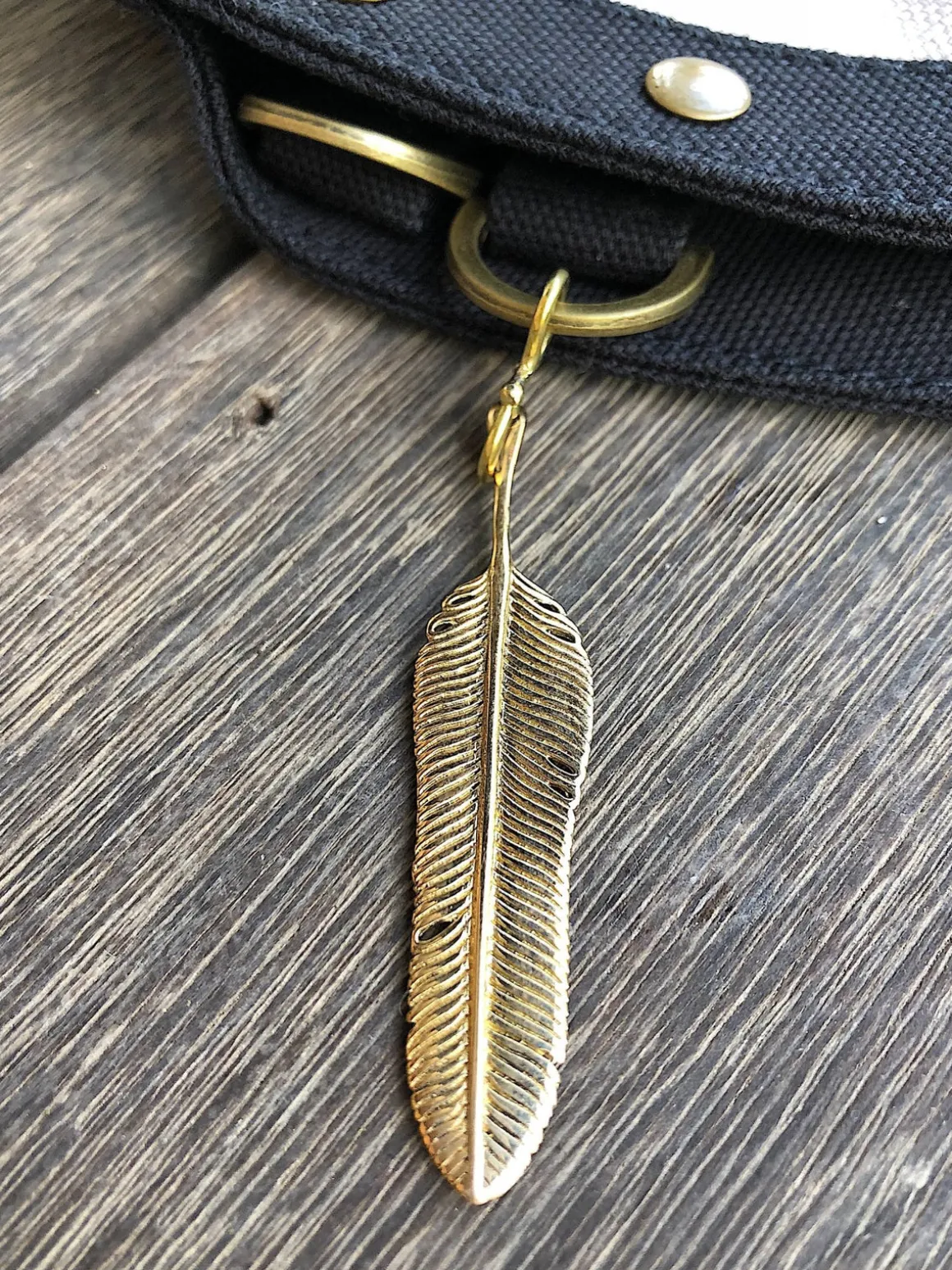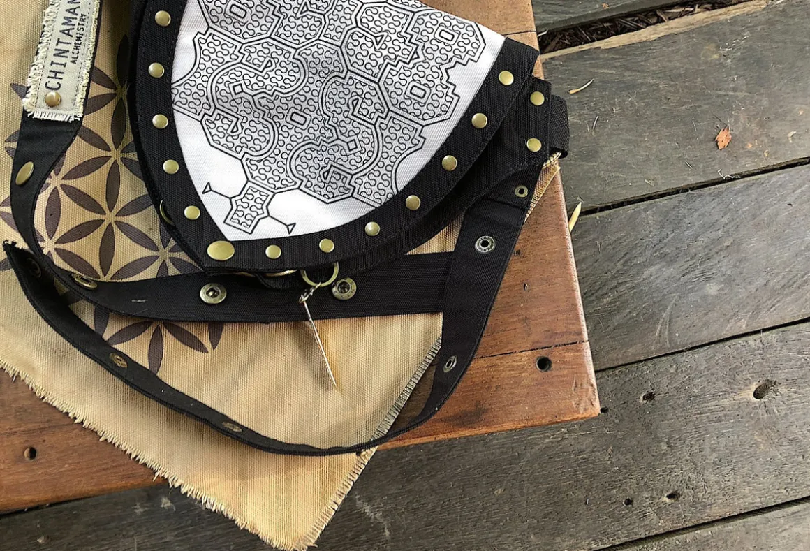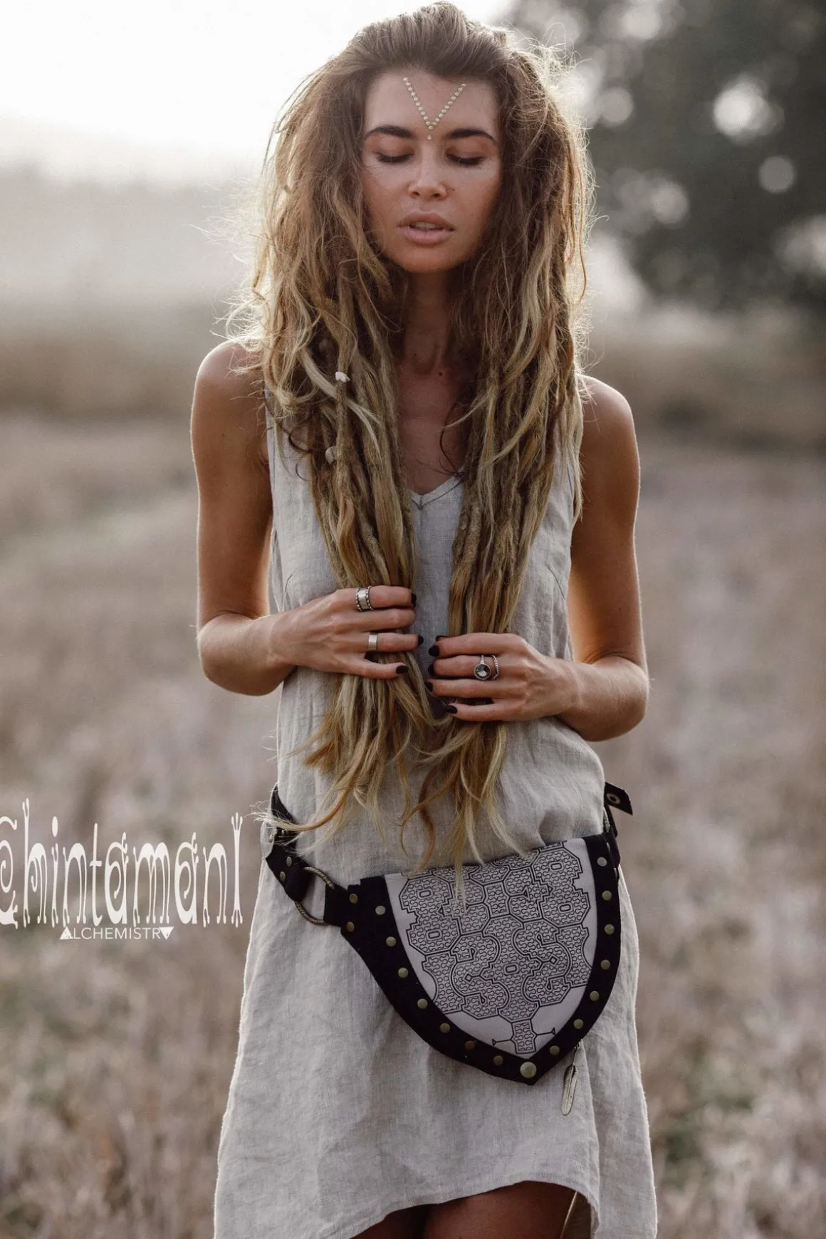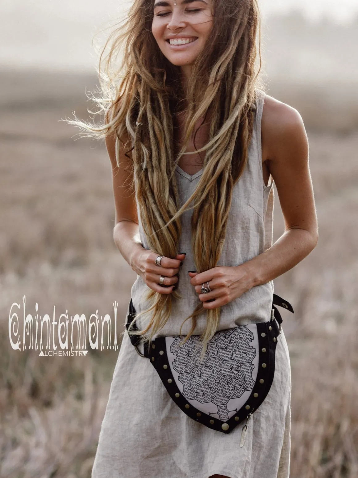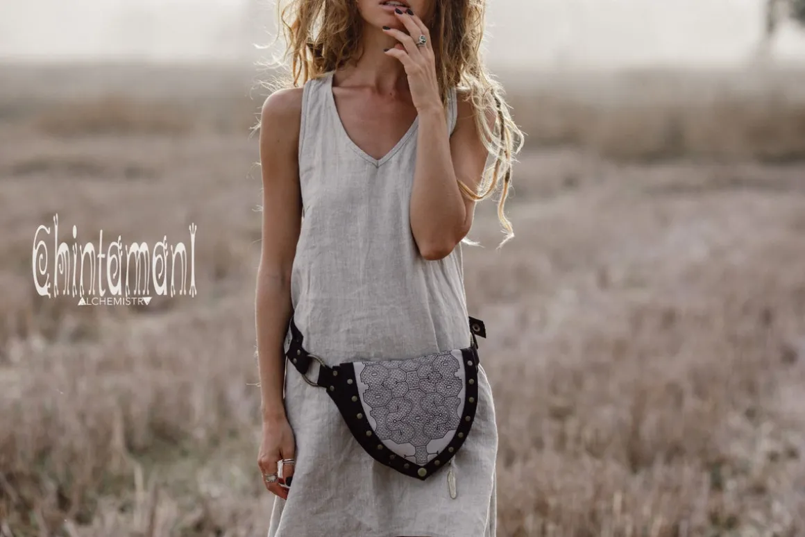 Chintamani Alchemistry Pocket Belt Bag is a very special original accessory, that we created long before the recent fashion rebirth of the pouches. Our Canvas Hip Bag unique “droplet” silhouette compliments skirts or dresses and looks more like a belt, than like a baggy fanny pack. To highlight its special design, the bag is decorated with brass rivets on the edge. The piece is very versatile – it can be worn across the body, with its adjustable snap buttoned belt, becoming a decorative stripe, that compliments and shapes floaty boho kimonos and tunics. The main pocket of the Waist Bag is big enough for the phone and small cosmetic necessities, while there are two extra pockets for valuables. Beautiful brass rings on the belt can be used to lock key carabiner or water bottle. Decorated with solid brass original feather. This thigh bag is available in various colors of our natural soft palette and with Shipibo sacred print. This amazing artifact from Chintamani Alchemistry is a true fashion statement, suitable not only for festivals, but for your normal city life as well.