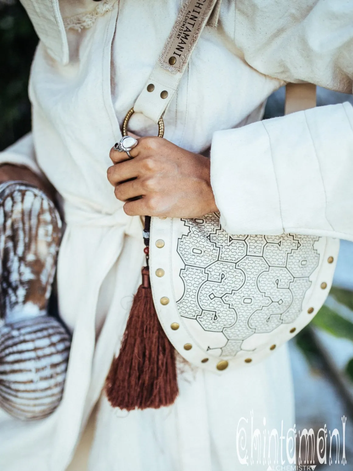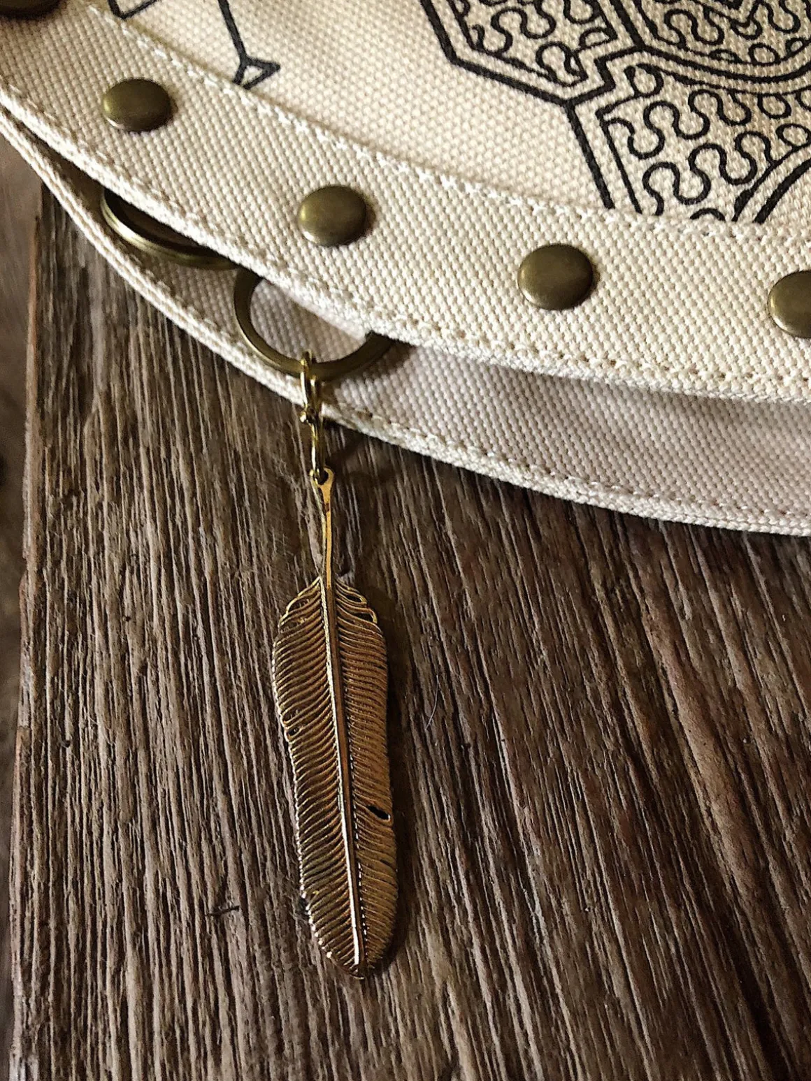 Chintamani Alchemistry Pocket Belt Bag is a very special original accessory, that we created long before the recent fashion rebirth of the pouches. Our Canvas Hip Bag unique “droplet” silhouette compliments skirts or dresses and looks more like a belt, than like a baggy fanny pack. To highlight its special design, the bag is decorated with brass rivets on the edge. The piece is very versatile – it can be worn across the body, with its adjustable snap buttoned belt, becoming a decorative stripe, that compliments and shapes floaty boho kimonos and tunics. The main pocket of the Waist Bag is big enough for the phone and small cosmetic necessities, while there are two extra pockets for valuables. Beautiful brass rings on the belt can be used to lock key carabiner or water bottle. Decorated with solid brass original feather. This thigh bag is available in various colors of our natural soft palette and with Shipibo sacred print. This amazing artifact from Chintamani Alchemistry is a true fashion statement, suitable not only for festivals, but for your normal city life as well.
