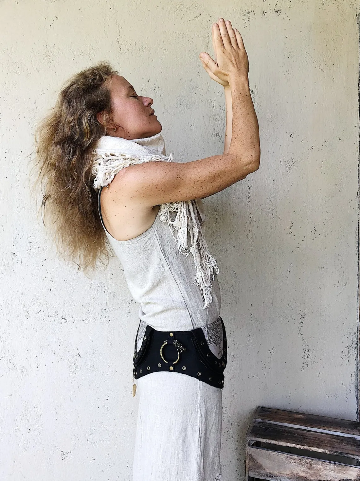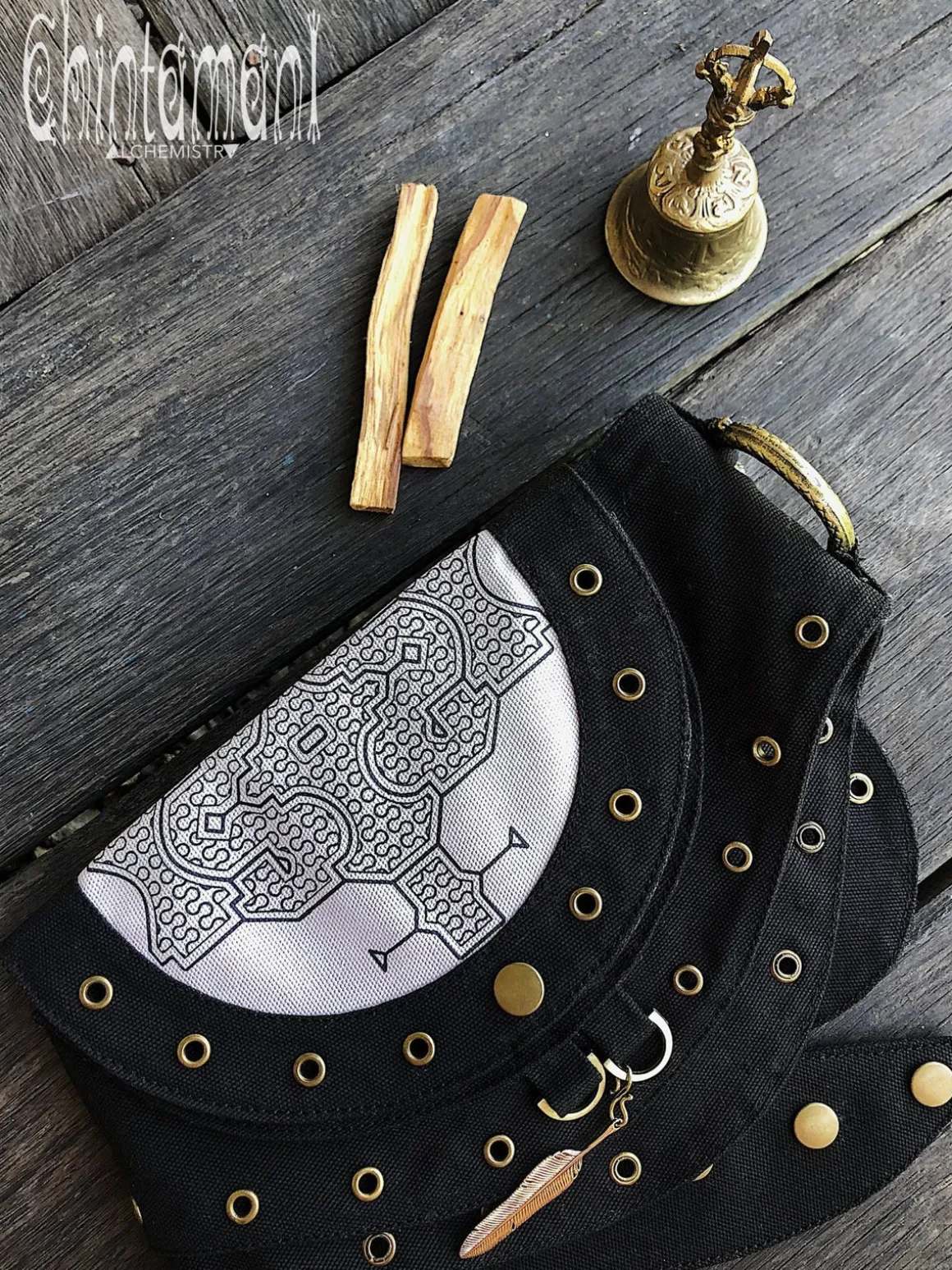 Two Pockets Hip Belt Bag is our classic Festival accessory. Very handy with its two large pockets, and stunningly gorgeous – it shapes any robe, tunic, skirt or dress into bohemian gypsy queen ceremonial gown at once! This Thigh Belt Bag closes with decorative row of snap buttons, so it is very adjustable. You can wear it high or low on the hips, and it is truly free size, fitting up to XL. This piece is both boho and oriental – with the massive brass dragon decoration on the back and screen printed Sacred Geometry patterns on the sides. For the pocket deco we have two options – Shipibo Conibo Indian design and ancient Flower of Life protective grid. There are several buckles, that can be used to clasp your key carabiner or different amulets, and this piece actually comes with one! It is our special solid brass feather pendant, the symbol of Chintamani Alchemistry!
