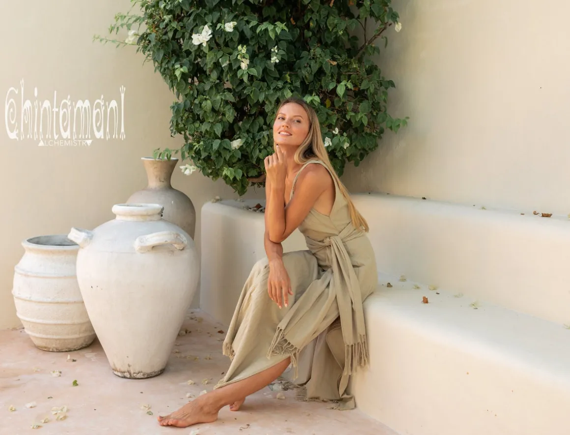 One more gorgeous Wrap Boho dress in our shop is a true masterpiece. It is made of very raw, natural thin and light cotton fabric in amazing natural colors. The dress is very easy to wrap around using the thin straps. Then for decoration and to accent your waist, you can tie around the thick belt with fringes, that comes in the set. On the warmer days you can just wear the piece simple and easy without the extra belt. Thin shoulder straps with decorative brass clasps are also perfect for hot summer days. They show off your shoulders and collar bones in a very elegant manner. Side slits make the silhouette even lighter. If you play with accessories, shoes or maybe add a kimono, it can be a base layer for a stunning boho evening gown. As it is – it’s just an amazing summer dress, made of very breathable and durable material.