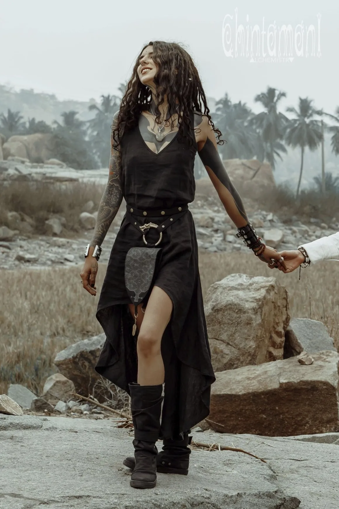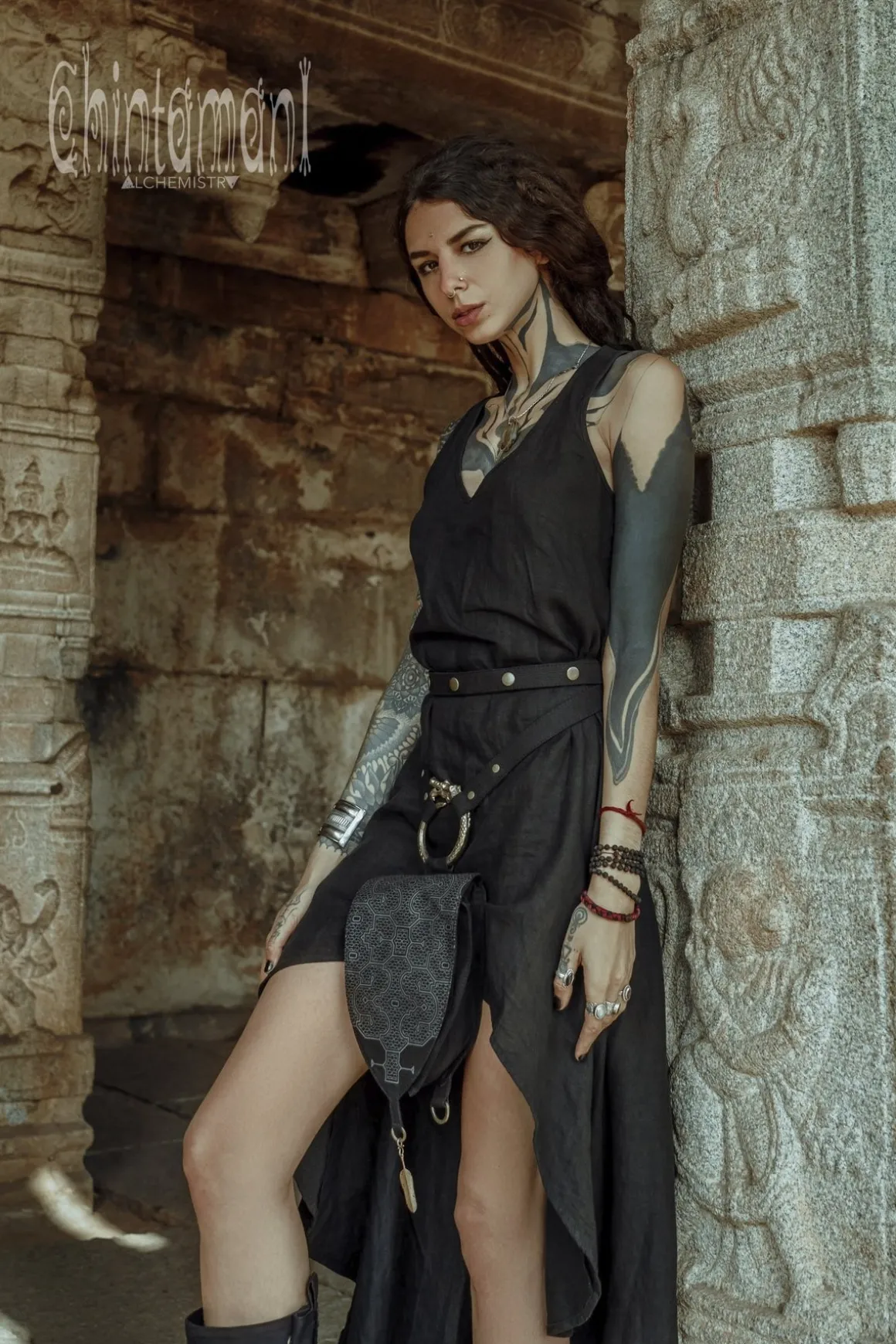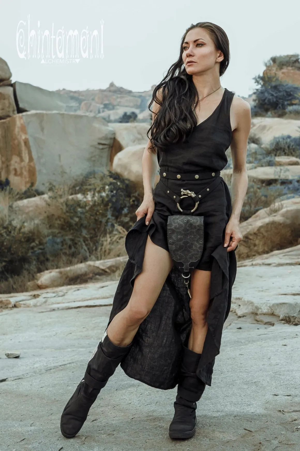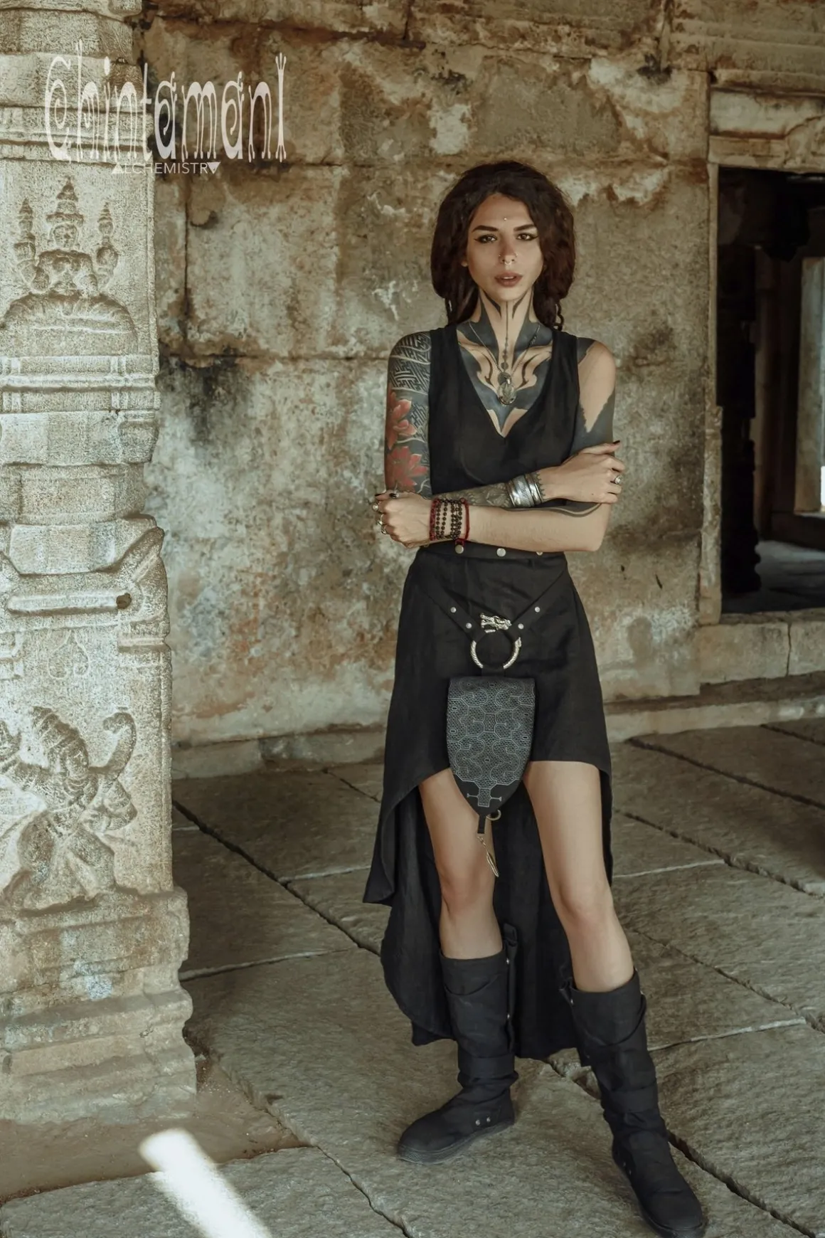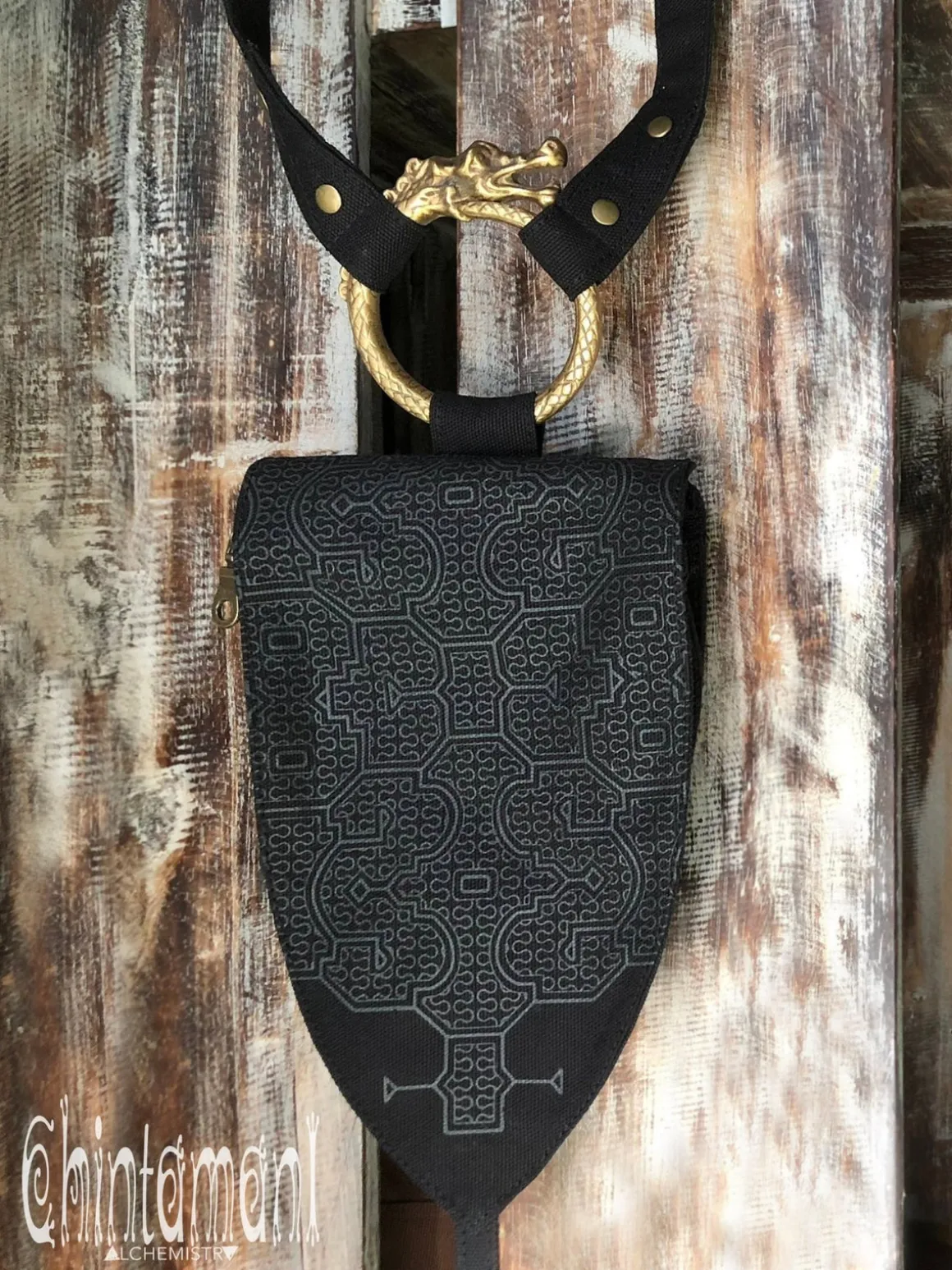 Big Dragon Transformer Unisex Holster Bag / Waist Thigh Bag is a gorgeous artefact of our unique design. It is amazingly flexible – it can be a Lara Croft holster bag or a little fairy backpack – you can transform its long belt with snap buttons in so many creative ways! Furthermore, you can choose your special color, it is available in 4 various shades: black, grey, beige and off-white. The droplet shape of this elaborate creation is reminiscent of medieval shields and coats of arms, big brass ouroboros ring is beautifully oriental and Shipibo screen print was inspired by art of Amazon rain forest tribes. All these many symbols are merged together in a very subtle, true Chintamani Alchemistry way – to create something that looks like an art object, but is quite useful! You can easily put your phone, money and other necessities into one main zipped compartment and two smaller secure pockets of this bag. As all our artifacts, this one is decorated by protective amulet – Chintamani Alchemistry brass feather pendant, handmade in our Bali jewelry workshop!