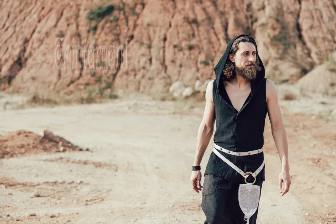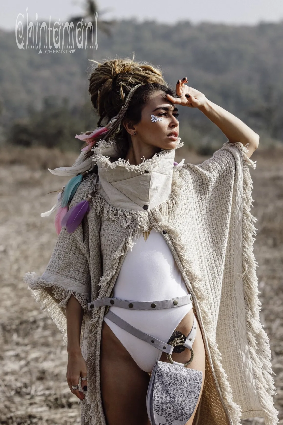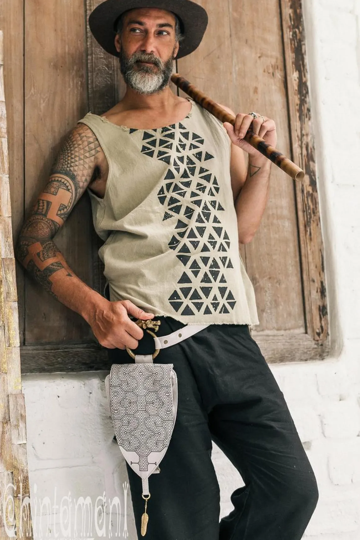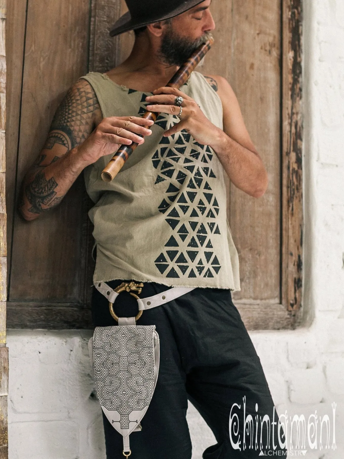 Big Dragon Transformer Unisex Holster Bag / Waist Thigh Bag is a gorgeous artefact of our unique design. It is amazingly flexible – it can be a Lara Croft holster bag or a little fairy backpack – you can transform its long belt with snap buttons in so many creative ways! Furthermore, you can choose your special color, it is available in 4 various shades: black, grey, beige and off-white. The droplet shape of this elaborate creation is reminiscent of medieval shields and coats of arms, big brass ouroboros ring is beautifully oriental and Shipibo screen print was inspired by art of Amazon rain forest tribes. All these many symbols are merged together in a very subtle, true Chintamani Alchemistry way – to create something that looks like an art object, but is quite useful! You can easily put your phone, money and other necessities into one main zipped compartment and two smaller secure pockets of this bag. As all our artifacts, this one is decorated by protective amulet – Chintamani Alchemistry brass feather pendant, handmade in our Bali jewelry workshop!