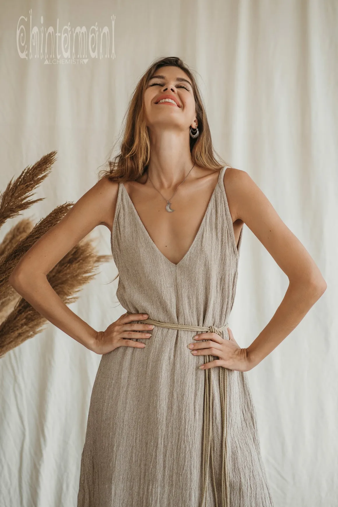 Long and gorgeous V-neck dress made of pure cotton – is a perfect base for boho layered look, or a classy outfit by itself. Natural cotton is very pleasant to wear. Long strait silhouette with subtle side slits is very simple and noble. Decorative fringe and macramé belt add the designer accent to the piece. It comes in our statement off white gentle color, but also in powerful red, black and earthly brown. It can be an evening dress, a festival outfit or just a favorite light summer seaside garment.