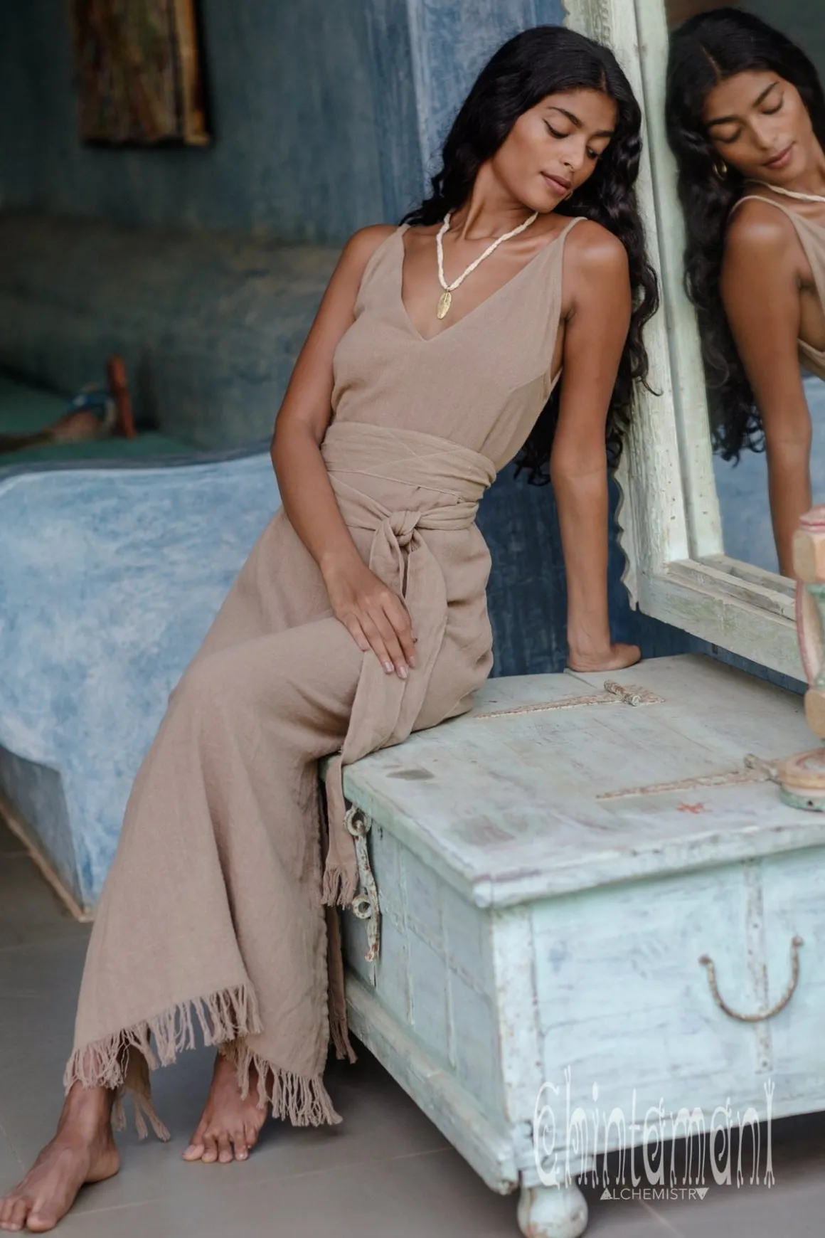 Long and gorgeous Vneck maxi dress made of pure cotton – is a perfect base for boho layered look, or a classy outfit by itself. Natural raw cotton is very pleasant to wear. Long strait silhouette with subtle side slits is very simple and noble. Decorative fringe and macramé belt add the designer accent to the piece. It comes in our statement off white gentle color, but also in powerful red, black, earthly brown, soft pink and delicate cappuccino. It can be a evening cocktail or prom dress, a festival outfit or just a favorite light summer seaside garment.