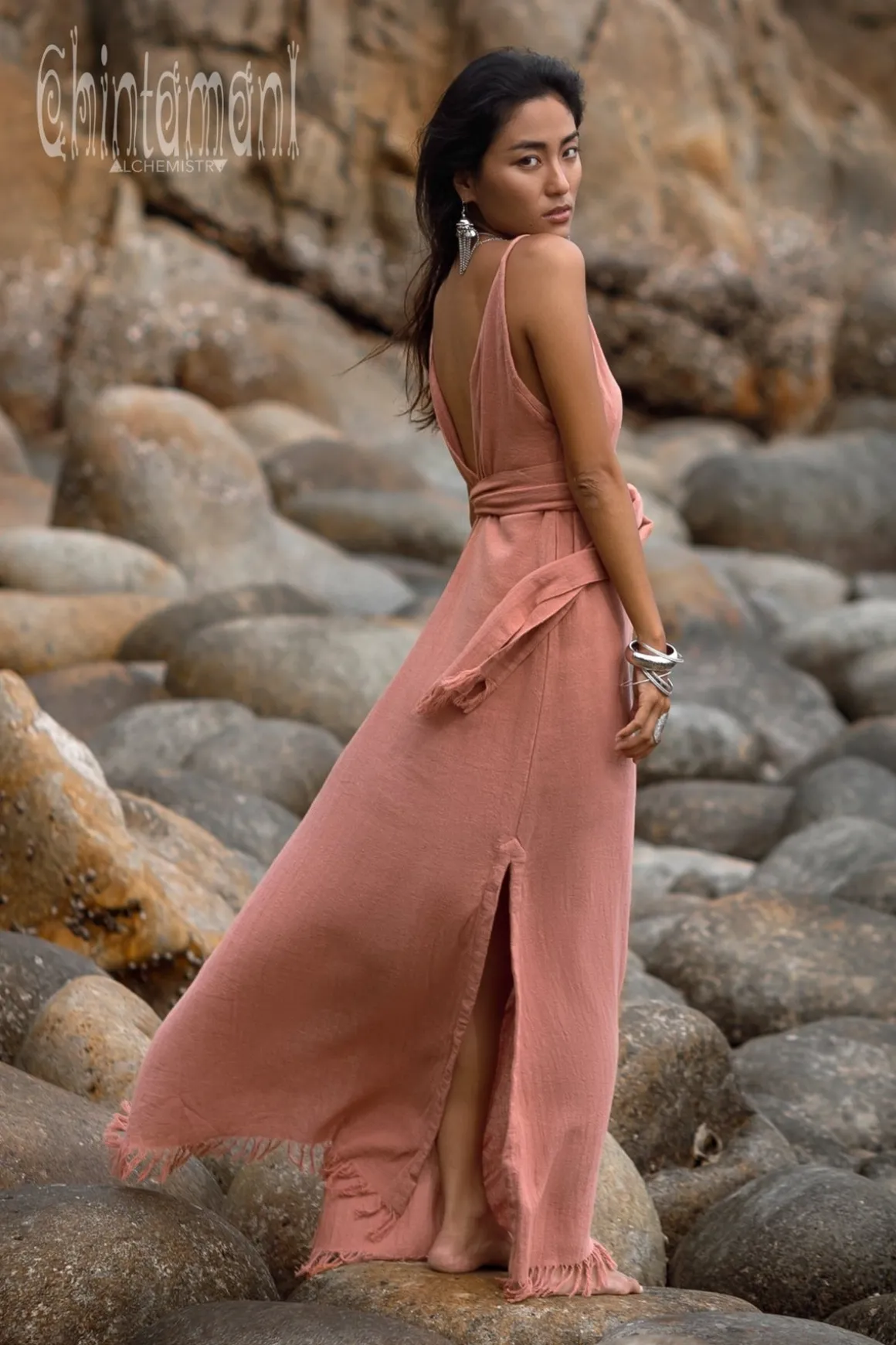 Long and gorgeous Vneck Maxi Dress made of pure cotton – is a perfect base for boho layered look, or a classy outfit by itself. Natural raw cotton is very pleasant to wear. Long strait silhouette with subtle side slits is very simple and noble. Decorative fringe and macramé belt add the designer accent to the piece. It comes in our statement off white gentle color, but also in powerful red, black, earthly brown, soft pink and delicate cappuccino. It can be a evening cocktail or prom dress, a festival outfit or just a favorite light summer seaside garment.