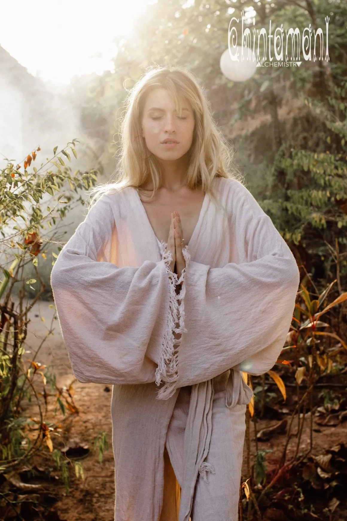 Raw Cotton Midi Kimono Dress with Long Sleeves was created as an artsy addition to our basic models, but also can be worn by itself as a cozy free size kaftan. This piece uses all the benefits of our favourite raw cotton fabric – it is airy, breathable, does not need to be ironed and looks stunningly natural. You can wear this kimono robe as a mantle, or shape it with the belt, that comes together with the model. Goes good with our cotton or linen dresses, skirts and raw cotton tops, can be a boho addition to jeans. This universal kimono cardigan is a wearable work of art!