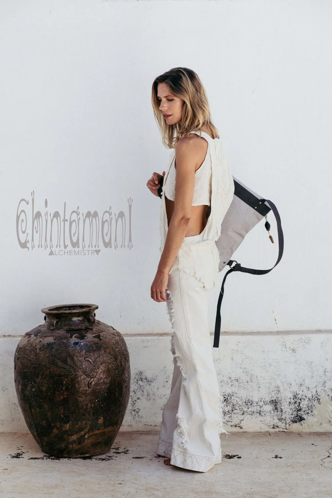 Rolltop Flat Laptop City Backpack, made of strong Cotton Canvas – it is a perfect every day bag and an ultimate fashion statement. This roll top piece is 100% vegetarian, as we do not use leather or any other animal products in its creation. The back of the model is made with two layers of canvas for extra strength, the straps can be adjusted, as they are tied around decorated brass rings. Backpack seals with zipper, and then the top can be rolled and fixed with magnets. There is a pocket inside for valuables, as well, as pocket on the back, which opens from the side and can be reached when you are wearing the backpack. It is quite spacious – you will be amazed, as you can fit even big professional notebook in this visually small bag! It comes in universal grey, stunning off white, gentle beige and classic black color, and is decorated with handprinted traditional Shipibo Conibo pattern, as well, as unique Buddha Head brass pendent, made by our artisans on Bali. Each and every backpack is a one of a kind artefact!
