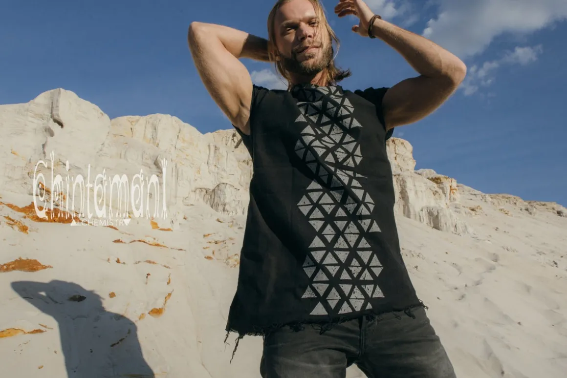 Atua Tino Chintamani Men’s T-shirt. Made of 100% raw natural cotton and decorated with handily processed graphic screen print on the front and on the back. Open Treads Down