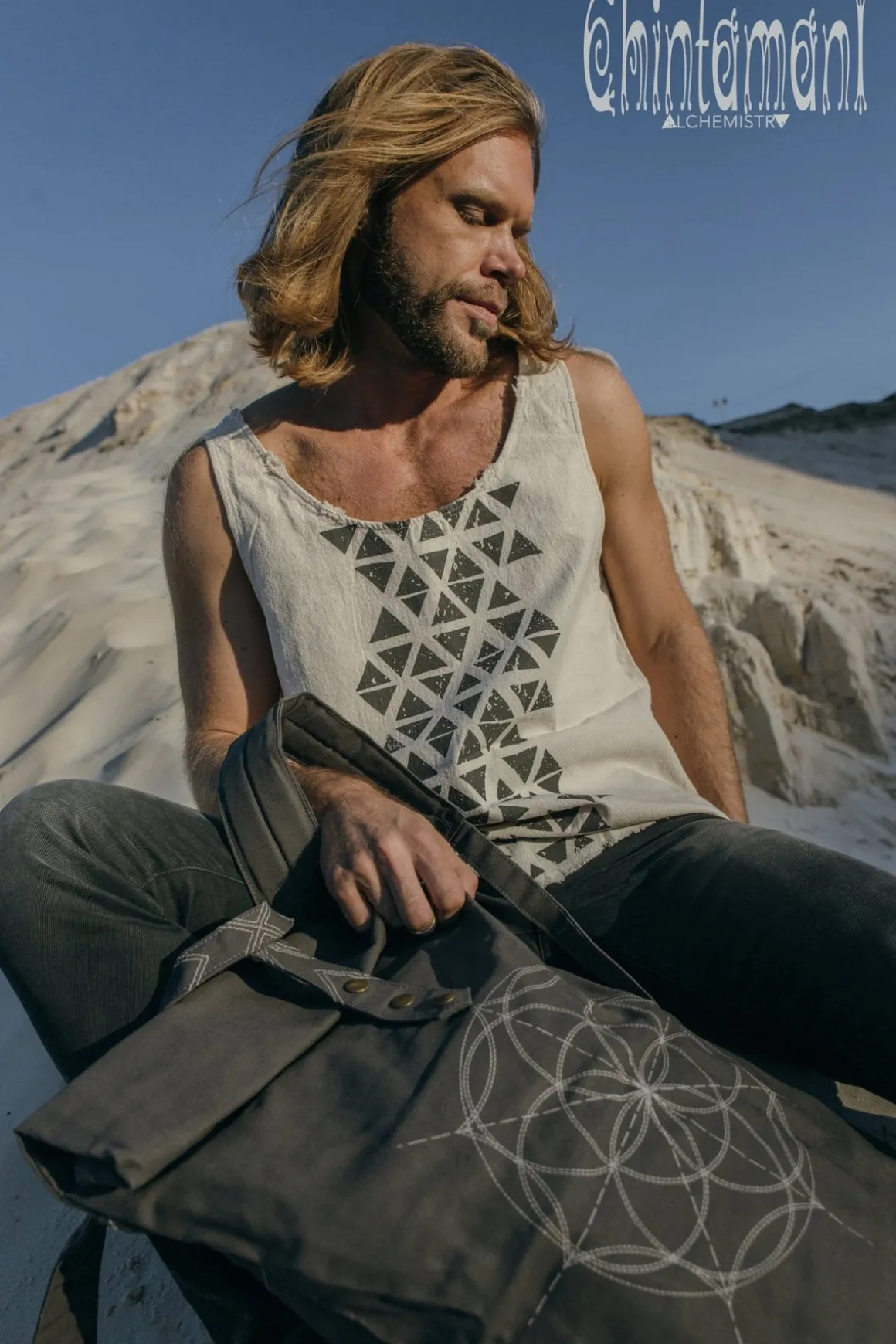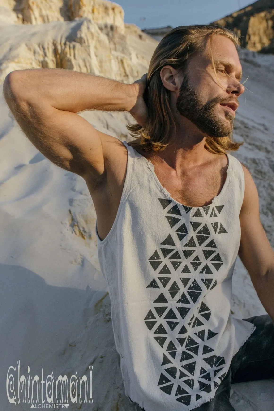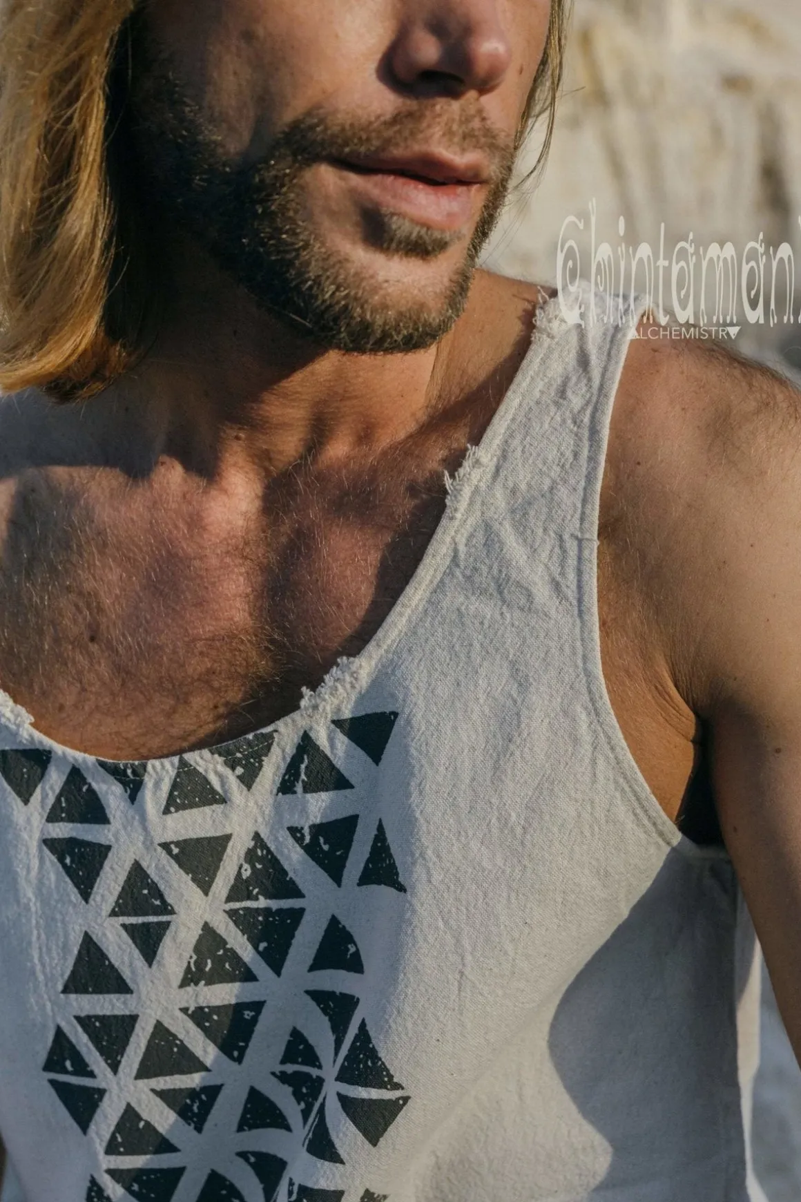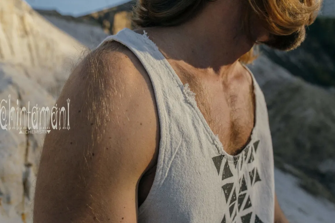 Atua Tino Chintamani Men’s tank top. Made of 100% raw natural cotton and decorated with handily processed graphic screen print on the front and on the back. Open Treads Down and partly of neck line making it totally naturally raw.