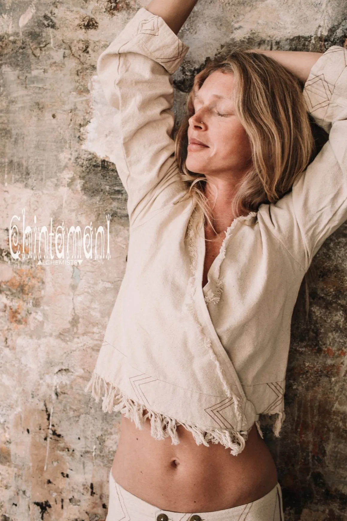 Off White long sleeved Boho Wrap Top is a gorgeous Chintamani Alchemistry creation with a very simple silhouette, adjustable to almost any type of figure. It is wrapped around and fixed with straps – in a very convenient traditional way. Made out of 100% natural raw cotton in amazing off white or classic black color, this Top is quite thick and durable, but very soft. It is decorated with geometric Navajo inspired embroidery and hand made fringes. Goes perfectly with our Wide Linen trousers or Flared Distressed jeans, as well, as all Chintamani Alchemistry skirts.