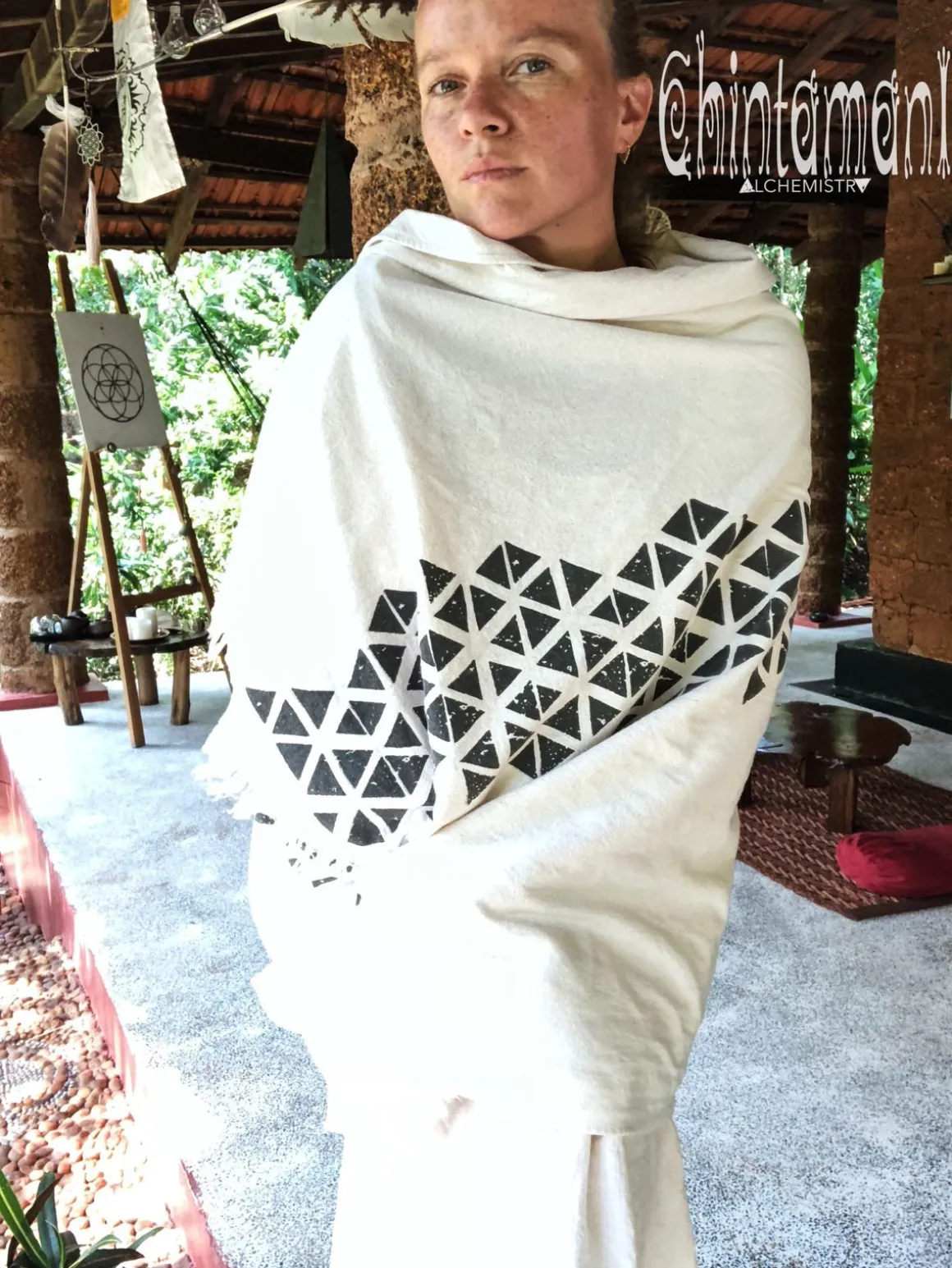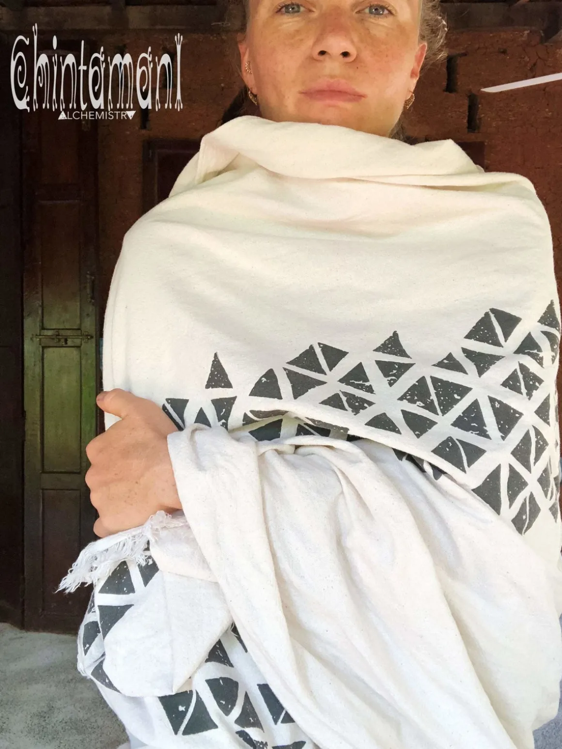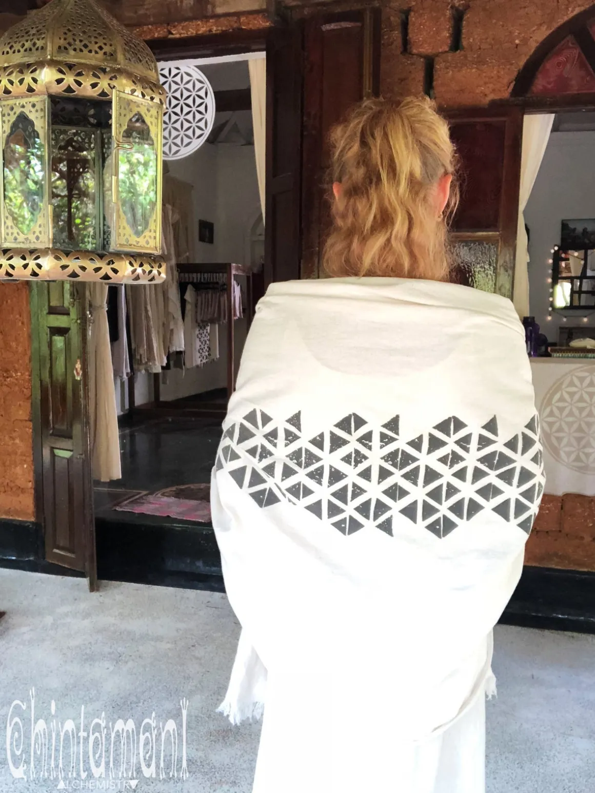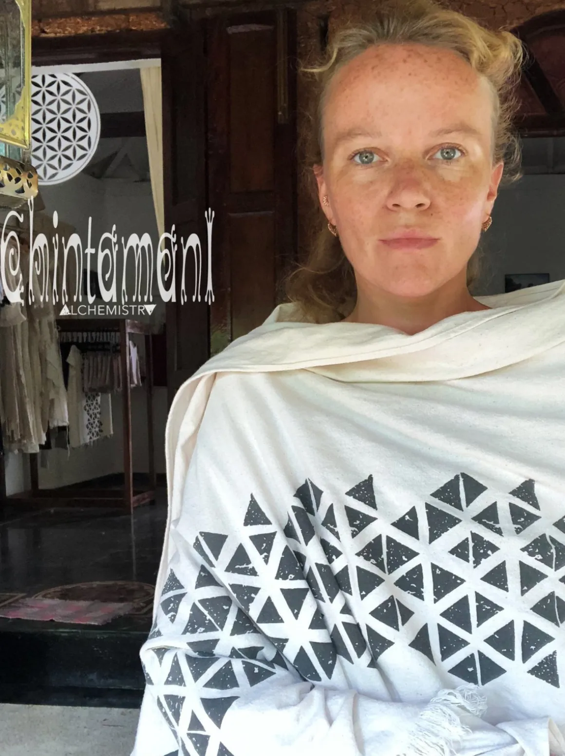 ATUA Organic Bohemian Shawl is a gorgeous accessory with geometrical handprinted tribal patterns. “Atua” means God in Polynesian, as well, as power or strength. Decorating their bodies with intricate geometric tattoos, which encrypt protective deities, Polynesian people believe, they connect to the divine force. Chintamani Alchemistry used this as inspiration for our simple triangular pattern collection. Atua Natural Cotton Boho Scarf gives you a taste of it. Made of wonderful soft pure cotton, this piece is very cozy and has an amazing raw look. It is quite long (210 cm) and can be used in various ways. You can wrap it up as a boho turban, use as beach sarong, as blanket and artistic furniture cover. And of course, it can be just a stunning simple scarf. The item comes in classic white or black color, to compliment most other clothes from Chintamani Alchemistry.
