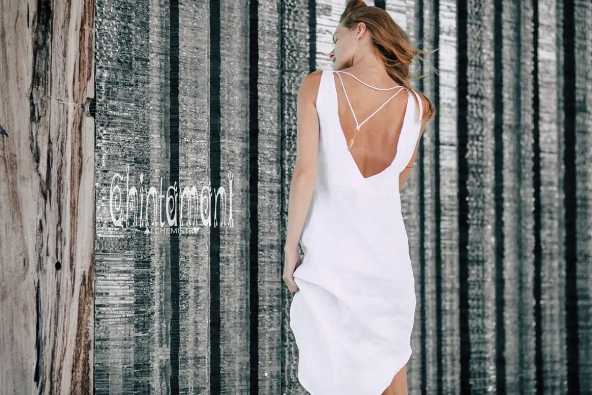 Stunning open white linen dress from our limited collection comes in two amazing fabrics – noble and durable 100% linen, or luxurious, divinely soft natural silk. It’s sophisticated silhouette shows off your back in a quite sensual way. Although, don’t worry – specially designed lacing with an amazing brass big feather pendant will keep the dress from sliding from your shoulders unexpectedly. As all our tunic dresses, it has our signature designer twist – it is little shorter in the front and longer in the back. A very convenient detail – the bosom of this tank dress is double layered, so you can wear it without any bra, for that very special sensation of soft caress and freedom of natural silk or linen! In fact, the feel of this little masterpiece on your skin is as good, as the looks of it in the mirror!