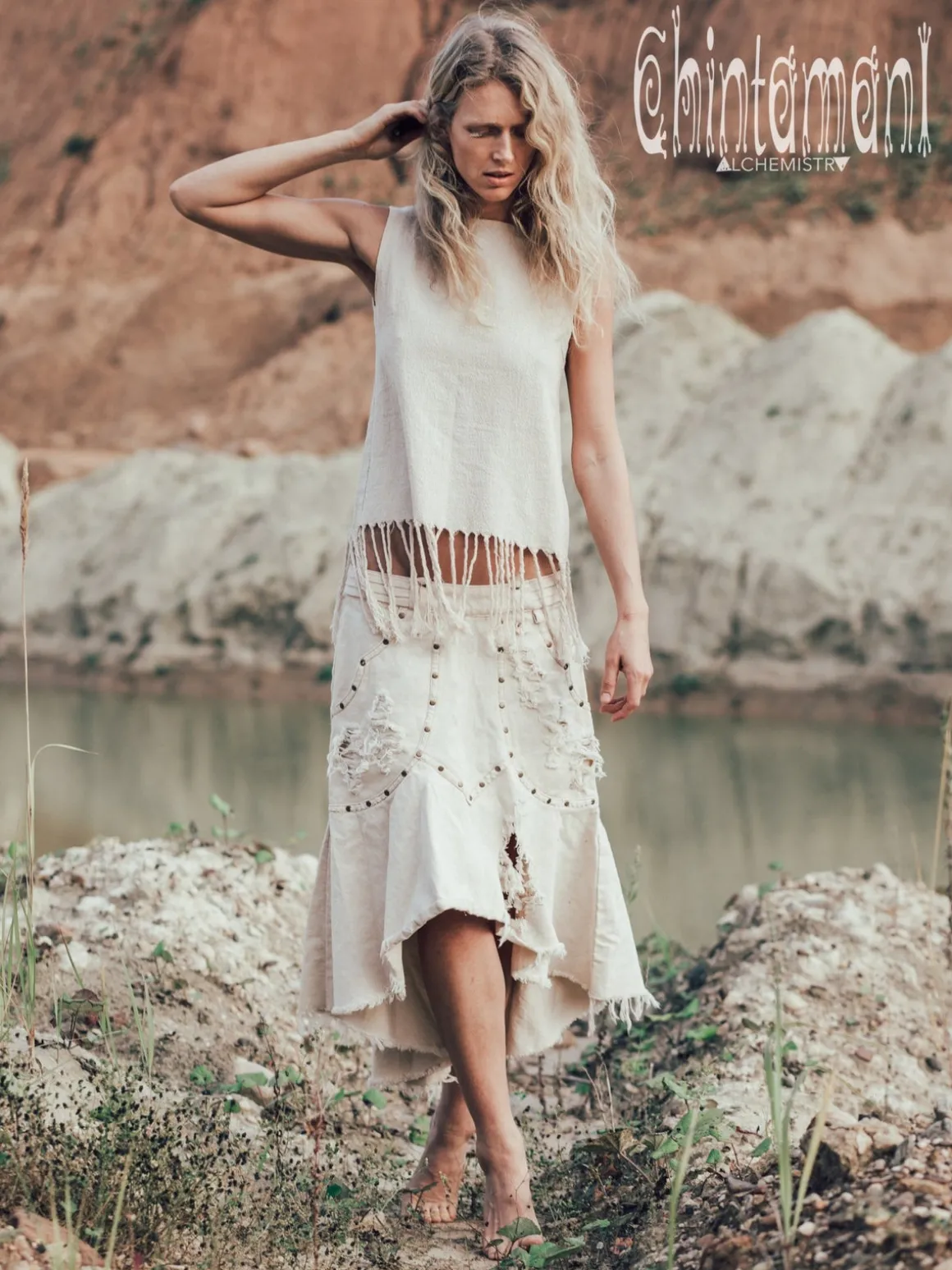 Bleached Denim Skirt is a very special item for jeans lovers, who want to add boho feminine touch to their wardrobe. This garment is low fit and looks especially good with our fringe tops and cotton canvas boots. For creating this boho skirt we use 100% cotton denim made in small factories in Indonesia. It is stone washed for extra softness, artistically ripped, bleached and decorated with clips to appear as an exclusive, one of a kind designer product.