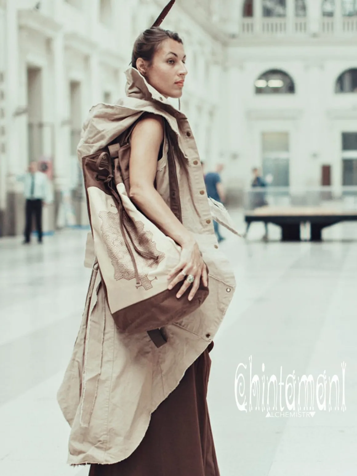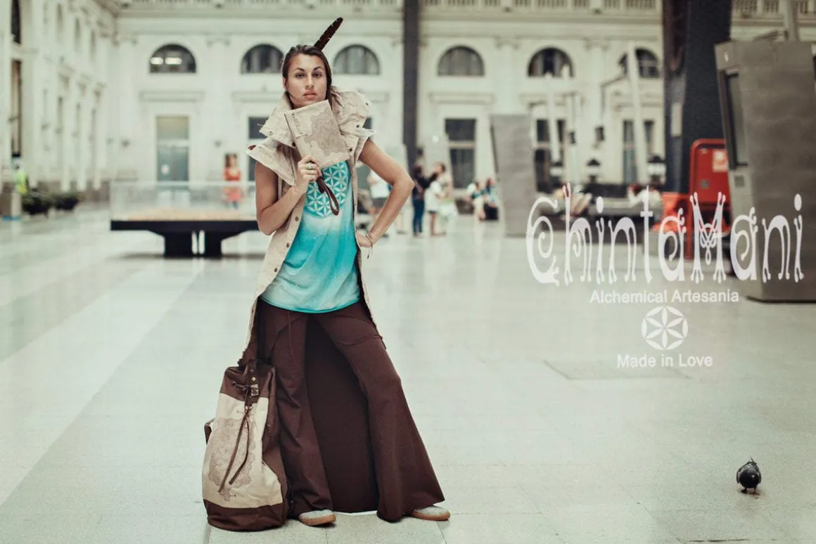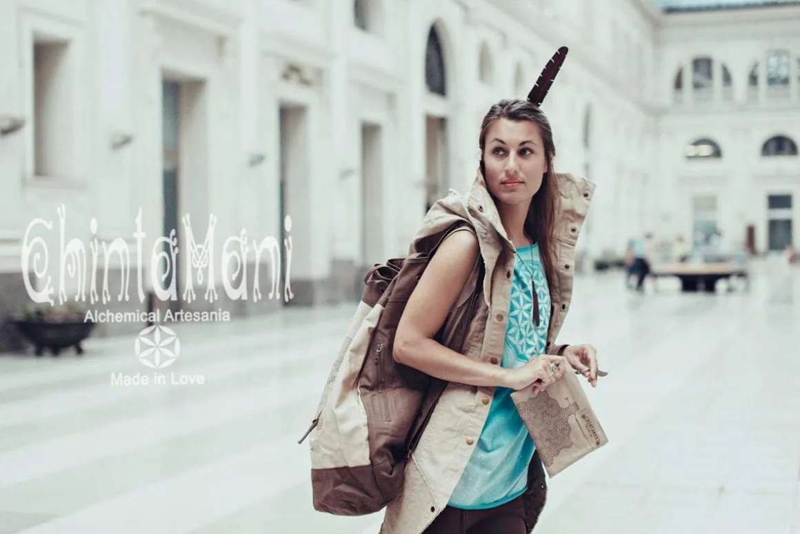 Spacious bohemian backpack for traveling or carrying your everyday activity stuff – you can even fit a yoga matt inside! Regulated straps with clasp buttons add character and convenience to this model. There is a big main chamber and a smaller laptop section in this torba bag, as well as inside zipped pocket for your valuables. We also add a safe easily reachable side pocket to put phone or keys. This stunning artefact comes in various colors and is decorated with solid brass feather pendant and our signature Sacred Geometry Flower of Life or Tribal Shipibo print. It is not only beautiful, but amazingly durable, as it is made out of very strong 100% vegetarian cotton canvas. This is a Chintamani Alchemistry unique creation to enjoy every day! pocket to have phone or key under your hand. Decorated with solid brass feather accessory.