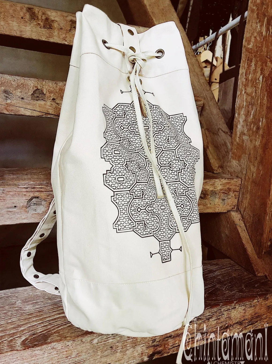 Capacious torba backpack made of strong canvas. Regulated shoulder belts for the size you need. Inside this boho backpack is a main part, laptop pocket + zip pocket for money or documents. Outside is a safe side pocket to have phone or key under your hand. Decorated with solid brass feather accessory.