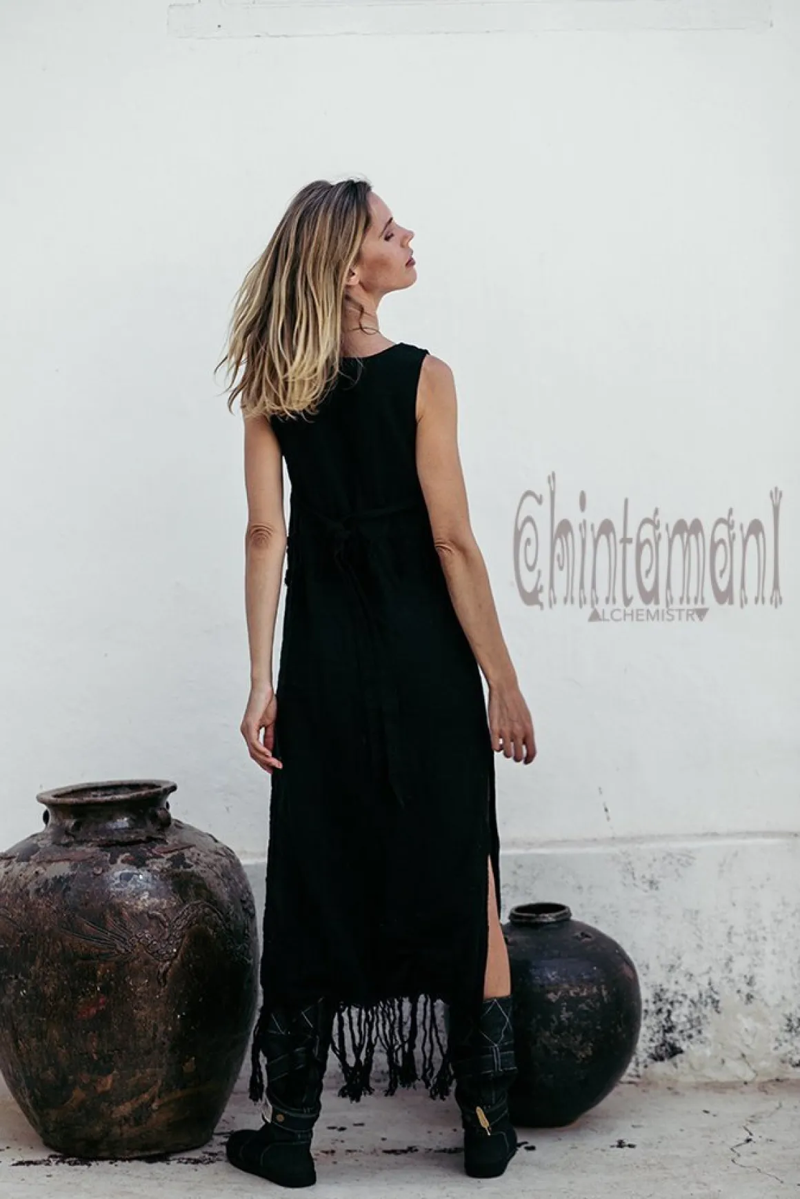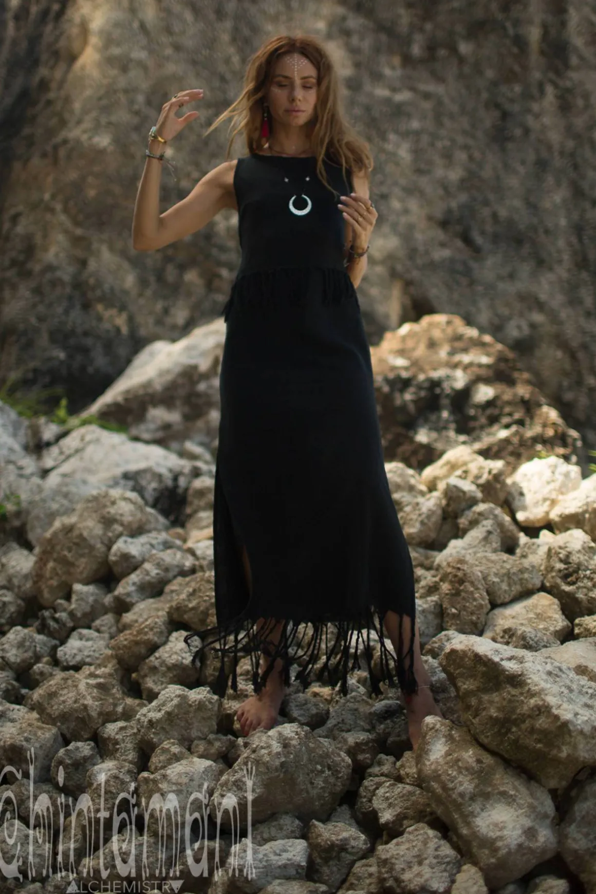 Raw Cotton Long Boho Dress with two layers of fringe. Unfussy and simple, yet gorgeous, this bohemian dress can be worn as a casual boho garment, but with the right accessories it can also become an impressive outfit for a special occasion. Fully handmade in raw natural 100% cotton to create that classic bohemian feminine look. Pair this organic goddess dress with sandals, cotton canvas Chintamani Alchemistry boots or simply go barefoot.