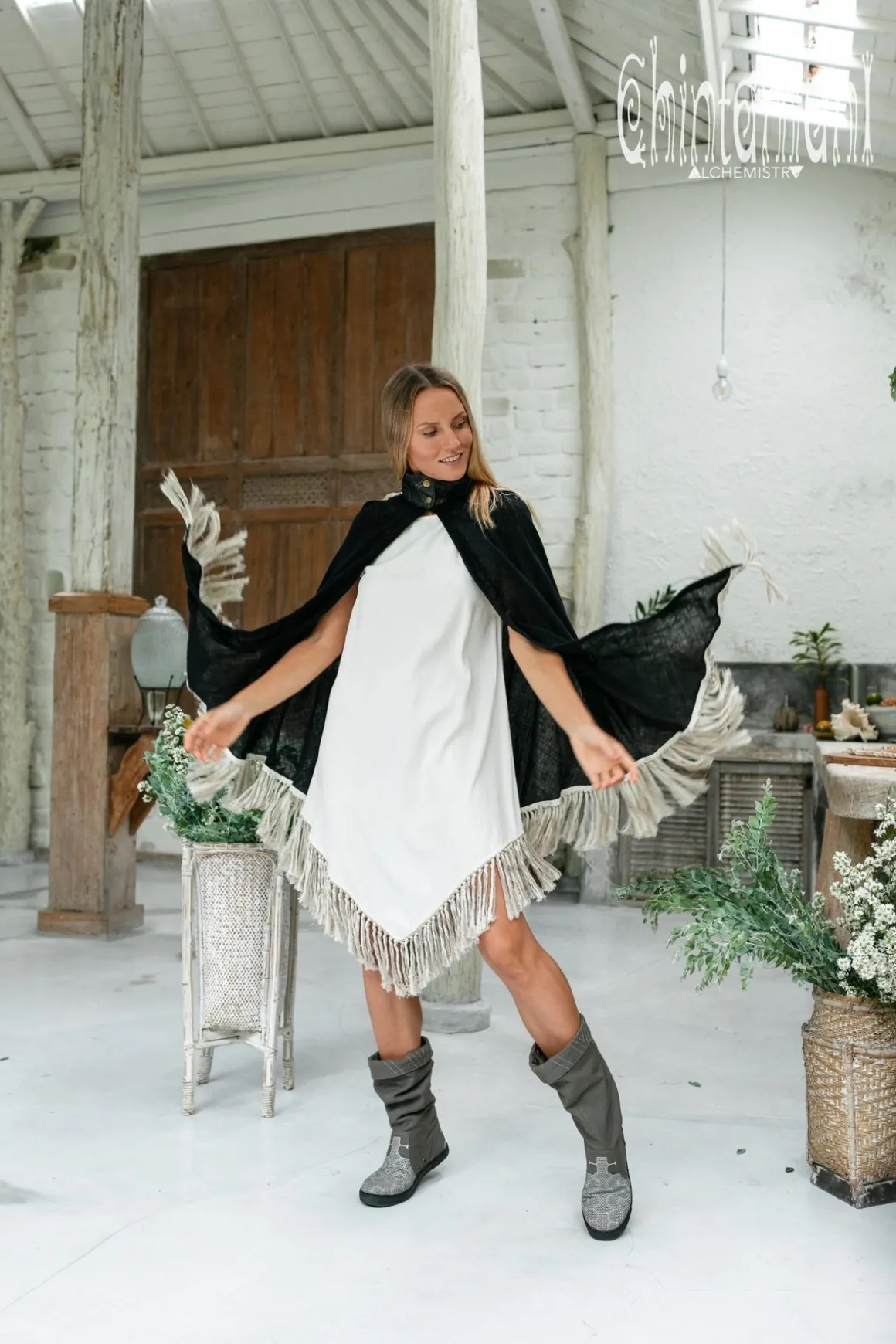 Long decorative fringes are handmade from 100% natural strong and thick linen, so that they are very durable and do not entangle after washing. The fringes usually come in a mix of two colors: one is the same tint as a garment it decorates, with the addition of raw unbleached silver-grey threads. It takes many hours to create this stunning decoration which makes each and every piece from our new collection a one of a kind artefact.
