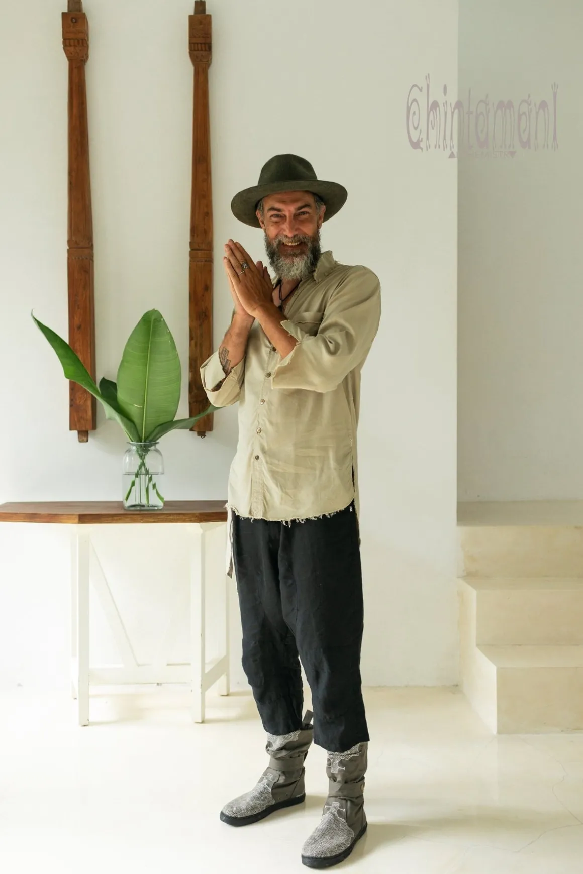 Man Cotton Shirt with Ripped Sleeves is a classy and nonchalant outfit for a very artistic bohemian look. It is made of soft, durable and pleasant to wear Cotton fabric, that will last for years with proper care. The fitting is quite tight, so choose a size bigger for more comfortable loose fit. Along with very elegant cut, this piece has a bunch of amazing handmade details, that make it look really unique. The open hemline, ripped edges on the collar and pocket and ripped 34 sleeves create subtle boho accents. Do not worry, the raw edges are specially stitched and secured to stay just like this, even after you wash this piece. We use beautiful brass buttons for this shirt. The slits on the sides and front pocket are decorated with handmade primitive embroidery to create that feeling of a garment, made by loving hands specially for you. Which is actually true with all Chintamani Alchemistry clothes!