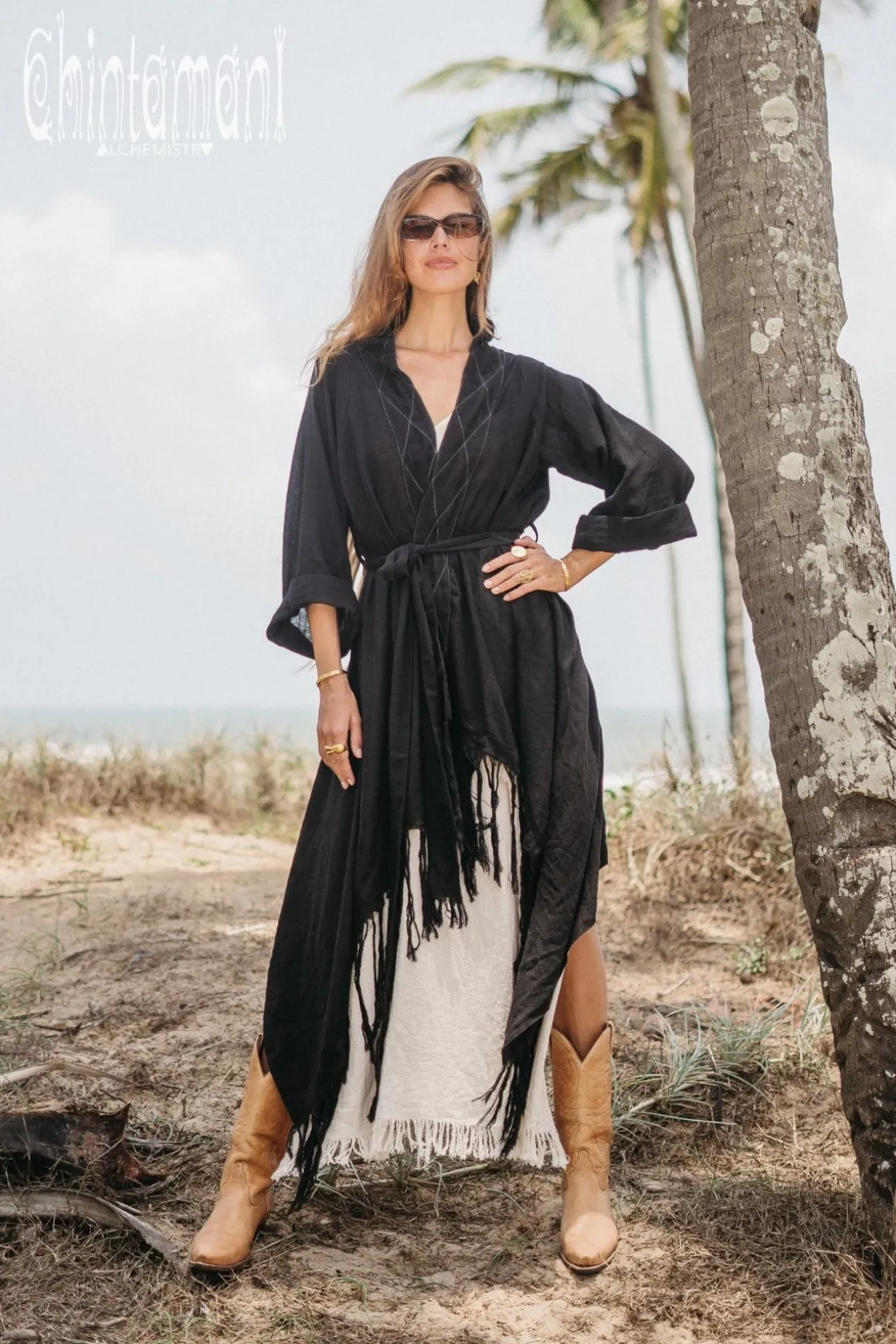 This gorgeous Asymmetric Kimono Cardigan is one of a kind creation, which we are extremely proud of. It is a universal piece – it can be used as a ready festival outfit or as a gorgeous addition to evening dress. It looks very bohemian with long skirt, but becomes a classy artistic coat if worn with jeans. The fabric of this piece, hand woven natural cotton, made in small batches in indian homes, is considered to be a national heritage. It is very light, breathable material, that look stunningly organic and raw. The kimono wrap top is adorned with hand stitched patterns and extremely long fringe. It comes in one free size and can be shaped in different forms by a beautiful decorated belt. It also can be worn as a royal kaftan mantle, creating that amazing flow of fabric while you move!