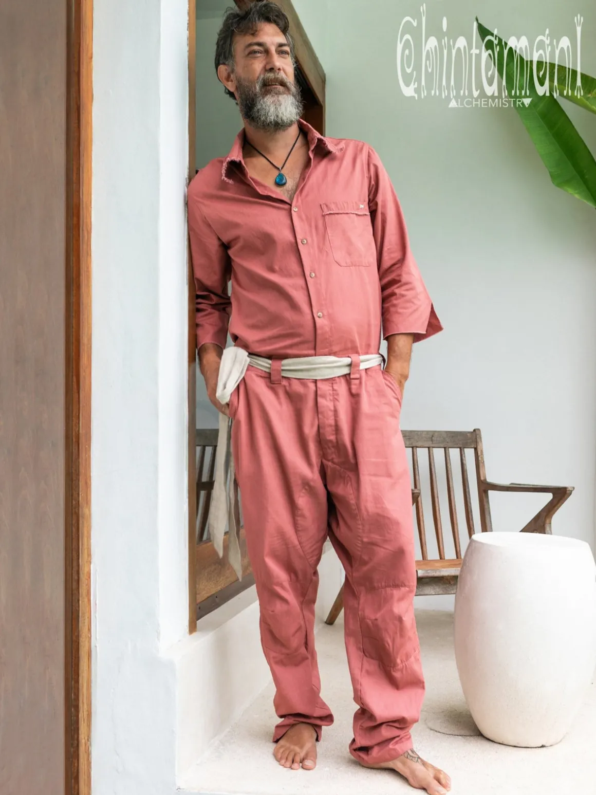 This is a fashion statement we were working on for years. Our elegant and cozy boiler suit for men with the perfect silhouette is finally here! 3/4 sleeves with raw cuff line are nice and easy during summer, and will also fit people with long arms. Full length trousers, narrow at the bottom, create a casual feeling to the piece. This amazing romper is made of 100% natural cotton twill fabric, which is strong and breathable, so you can easily wear it without any underwear. It combines nicely with boots or just flip flops to feel just right even in the heat. This model comes in light raspberry pink color and can be shaped by gray linen belt. Just throw this one on – and you are dressed for the whole summer!