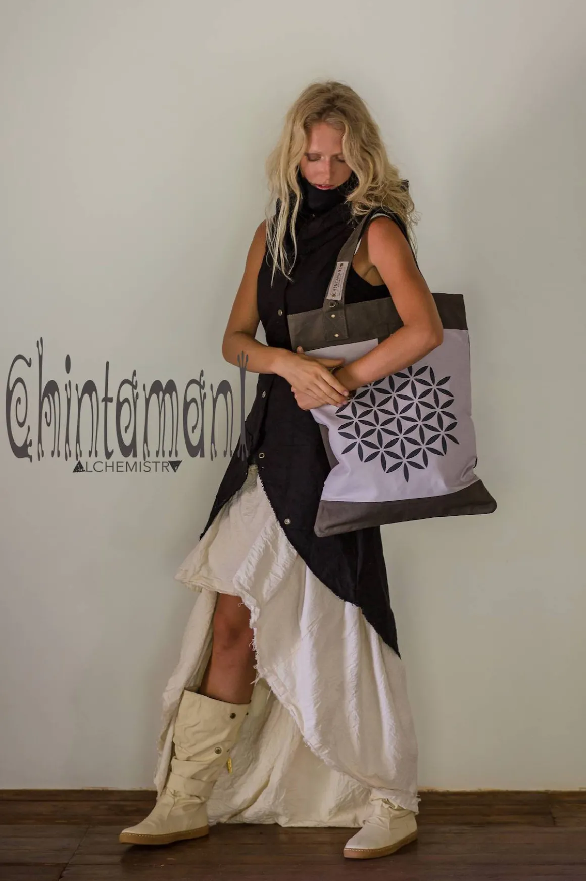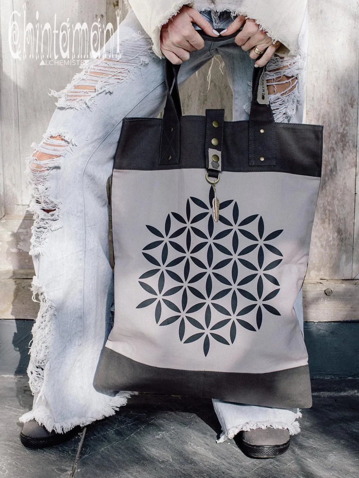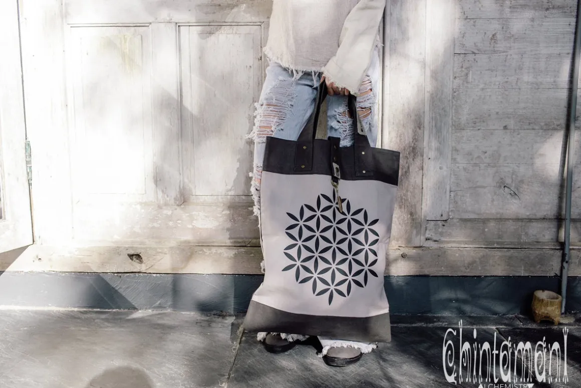 Beautiful Cotton Canvas Tote Bag is a simple and handy accessory for everyday shopping. Why use single use plastic bags from the shops when you can opt for this gorgeous reusable alternative! The handles are very strong – so you can be confident about filling it up. It has a secure inside pocket for your keys and wallet. As with all our bags, this stunning Shoulder Bag is decorated with handmade Sacred Geometry screen prints. For this model we use the ancient Flower of Life pattern. The lock of the bag comes with our little pendant compliment – decorative brass feather Made in Love by our artisanal workshop on Bali.