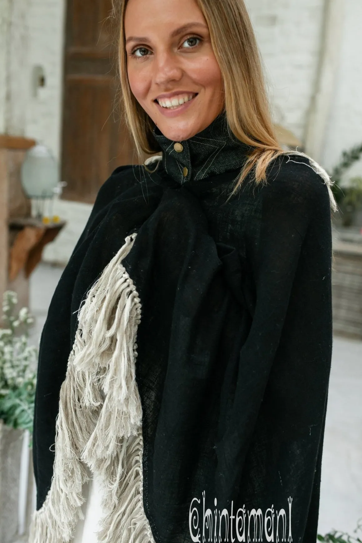 Cotton Open Back Poncho is a very original designer garment to compliment your boho outfit on a cool summer evening. High cotton canvas collar is reminiscent of elegant XIX century lady cloak, while long gorgeous linen fringe on the hemline brings an ultimate boho touch to the piece. The back of the poncho is open and also decorated with the statement fringes of our Alma Libra collection. It is made of 100% natural raw and very soft cotton. In hot climate you can wear this Poncho with our open back dresses, for light and layered boho ensemble. In cooler weather just put on some warm dress, shirt or long sleeve sweater underneath – and you are fully protected, while still looking gorgeously bohemian. It comes in 4 colors: Black, Off White, Dusty Pink and Desert Sage.