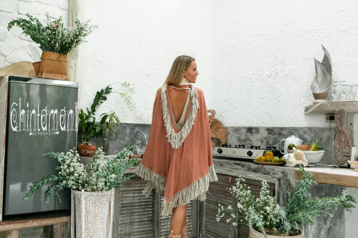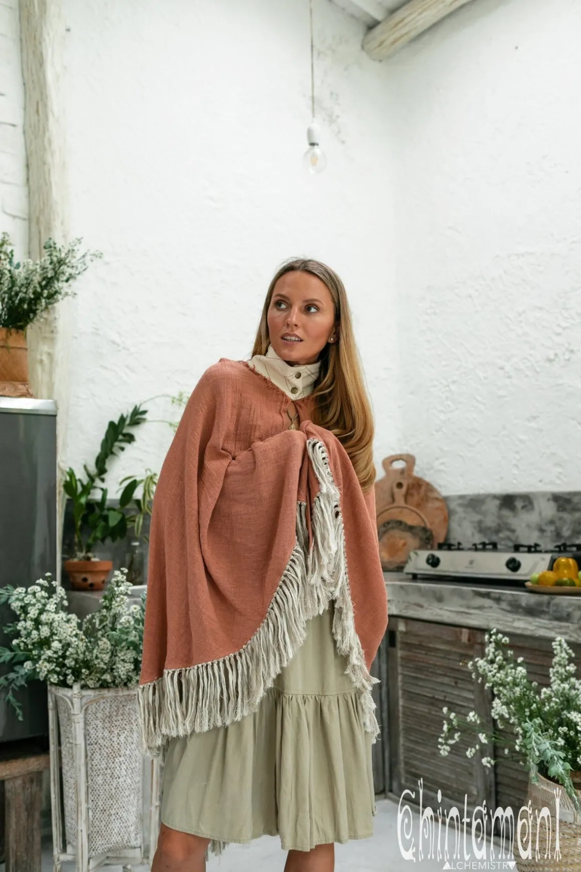 Cotton Open Back Poncho is a very original designer garment to compliment your boho outfit on a cool summer evening. High cotton canvas collar is reminiscent of elegant XIX century lady cloak, while long gorgeous linen fringe on the hemline brings an ultimate boho touch to the piece. The back of the poncho is open and also decorated with the statement fringes of our Alma Libra collection. It is made of 100% natural raw and very soft cotton. In hot climate you can wear this Poncho with our open back dresses, for light and layered boho ensemble. In cooler weather just put on some warm dress, shirt or long sleeve sweater underneath – and you are fully protected, while still looking gorgeously bohemian. It comes in 4 colors: Black, Off White, Dusty Pink and Desert Sage.