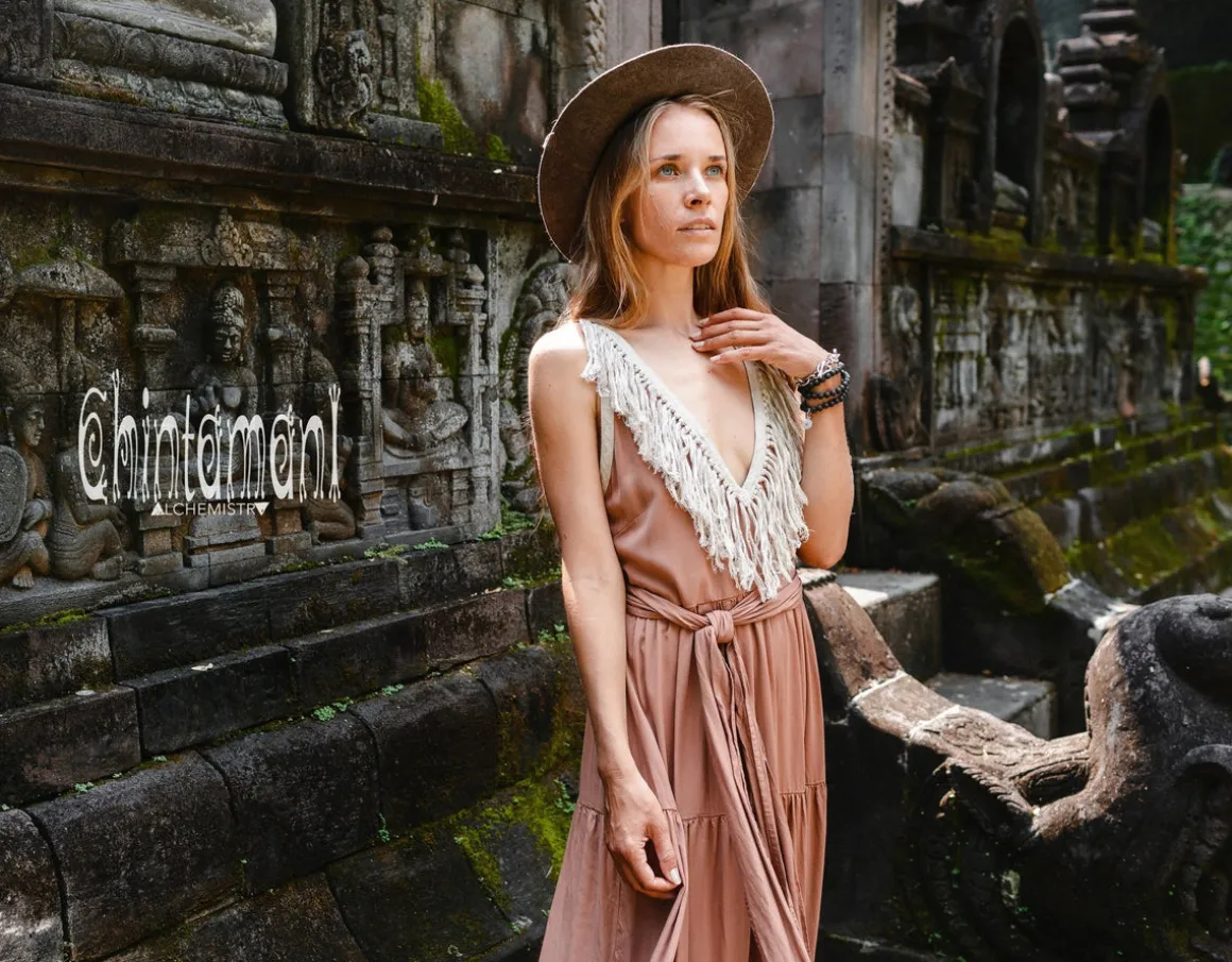 Tiered Maxi Dress with Fringes is another gem from our Boho Alma Libra collection. It is a very graceful outfit, with timeless silhouette. Gorgeously feminine and so pleasant to wear, it will look amazing with heeled sandals or our ethnic canvas boots. Stunning long linen fringe on the neckline complete the Bohemian Princess look. Open back adds the charm and makes it even more suitable for hot and lazy summer days. It is very floaty by design. Light, soft and natural Cotton fabric brings this idea to life perfectly. You can use fringed belt, that comes with the dress, to accentuate waistline, or just wear it free and simple.