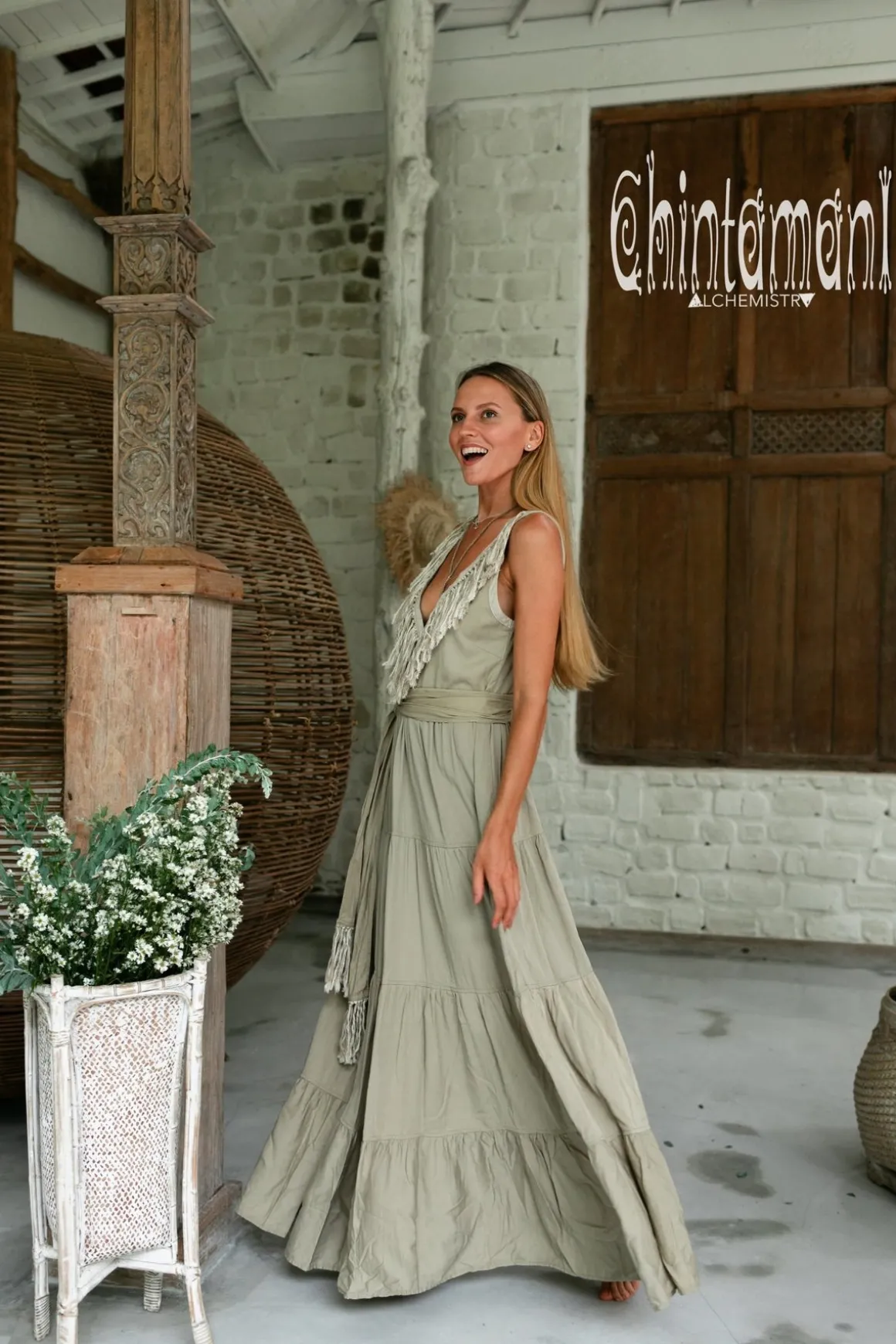 Tiered Maxi Dress with Fringes is another gem from our Boho Alma Libra collection. It is a very graceful outfit, with timeless silhouette. Gorgeously feminine and so pleasant to wear, it will look amazing with heeled sandals or our ethnic canvas boots. Stunning long linen fringe on the neckline complete the Bohemian Princess look. Open back adds the charm and makes it even more suitable for hot and lazy summer days. It is very floaty by design. Light, soft and natural Cotton fabric brings this idea to life perfectly. You can use fringed belt, that comes with the dress, to accentuate waistline, or just wear it free and simple.