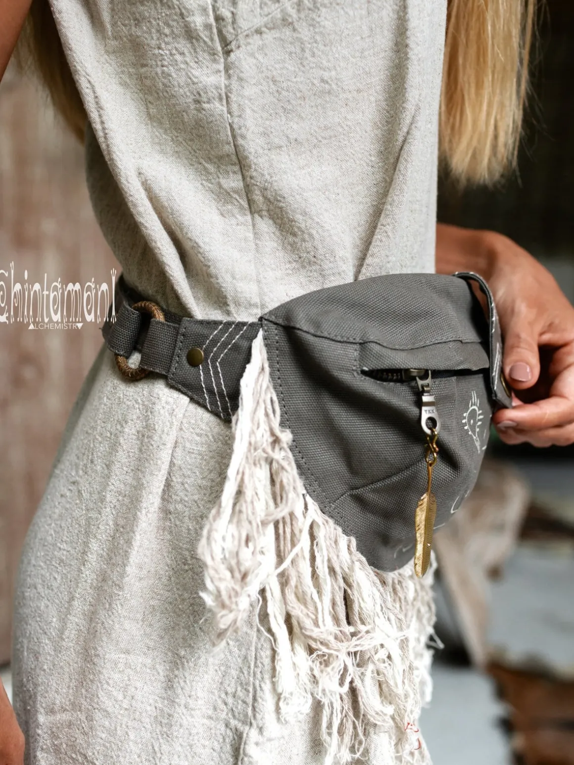 Our classic canvas banana hip bag just got a fresh restyling with amazing Long Linen Fringes! Now it also comes with a magic new Alchemy print, based on 9 powerful symbols: Sun, Air, Moon, Purification, Alchemy, Spirit, Water, Fire and Earth. We created this artefact with respect for the main forces of nature, using only vegetarian natural materials: strong cotton canvas for the main bag, pure linen for the fringe and solid brass for decorative feather pendant, our own signature symbol of Lightness and Freedom. Like all our belt bags this one is very flexible and adjustable. Its belt is decorated with a row of metal clasp buttons, so you can easily regulate the length. Alchemy waist bag can be worn on your waist or across the back, which looks amazing with dresses or kimonos when you do not want to break up the silhouette in the middle. It can also become little shoulder bag! The main pocket is quite big – you can fit almost any phone, passport and wallet. Also there is a small pocket for valuables on the inside of the bag. This bag is a perfect travel companion, and also it is a transformational alchemical accessory, that influences not only your look, but your mood.