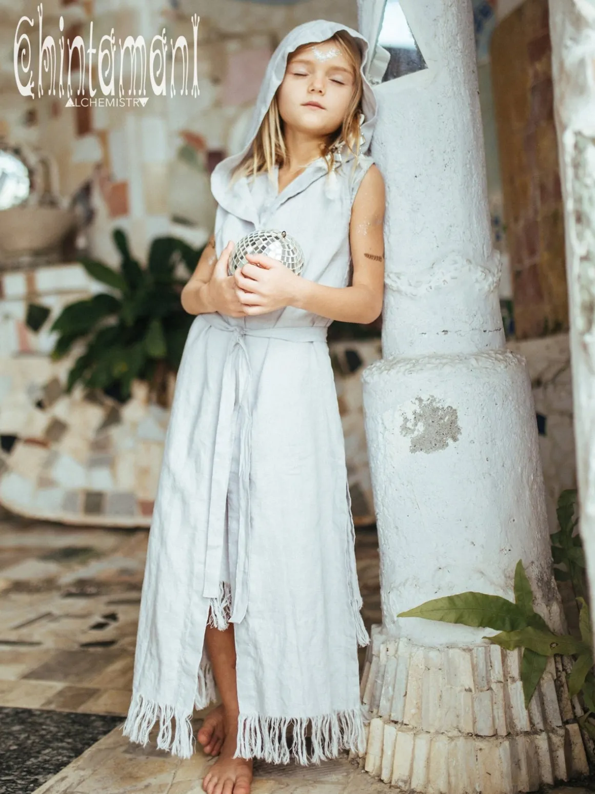 Perfect composition to mother’s linen look. Chintamani kids tunic with custom made seed of life brass buttons. Its a long top style hooded cover with buttons and belt. Fits perfect with dress, pant, skirt or leggins. We were inspired to see how small woman loves them.