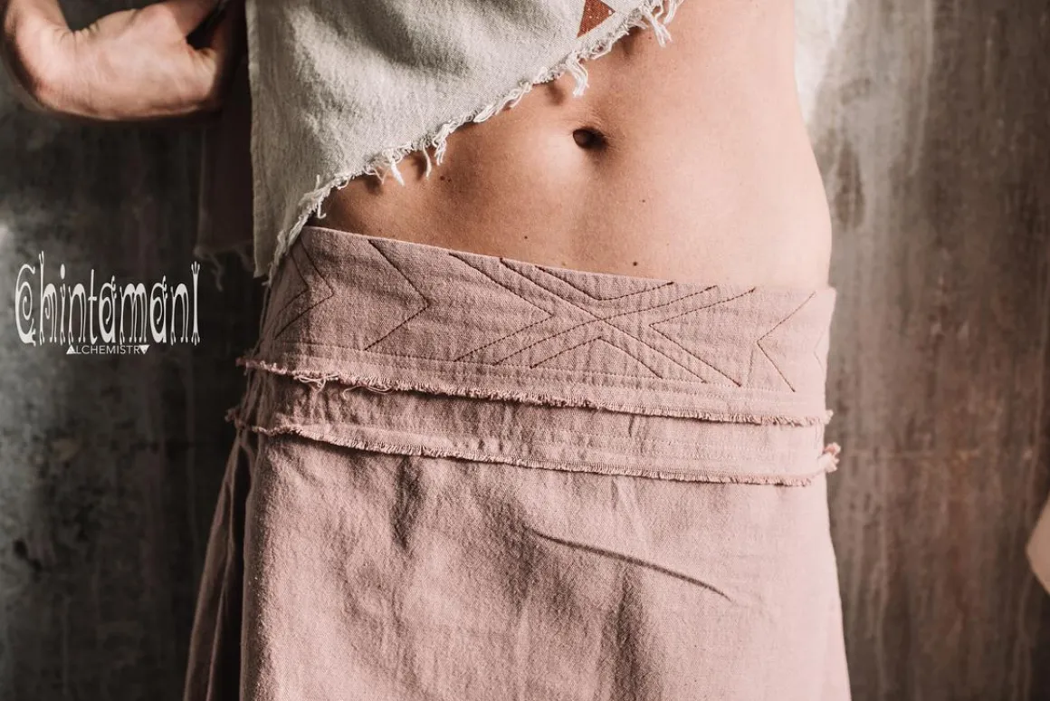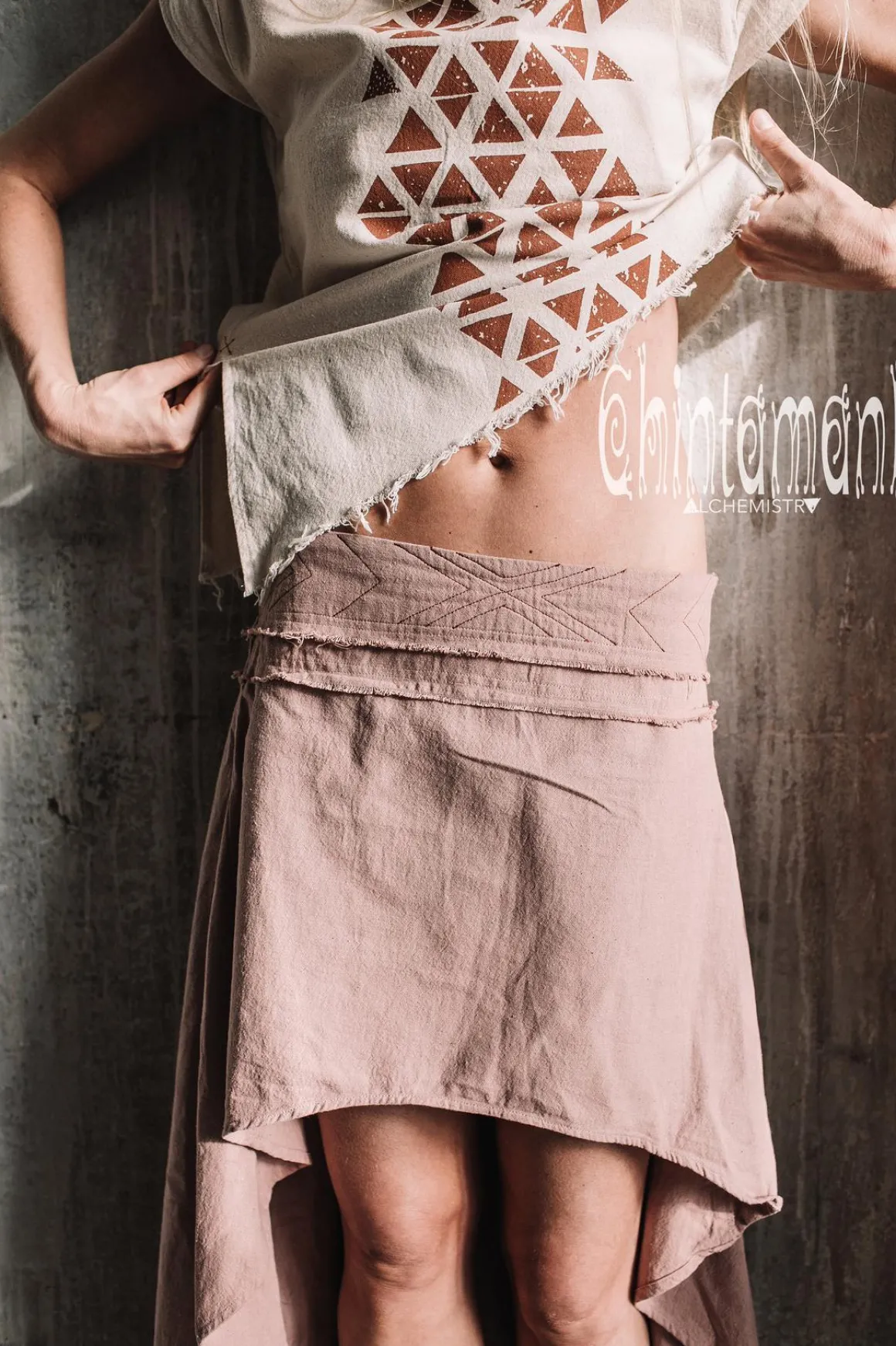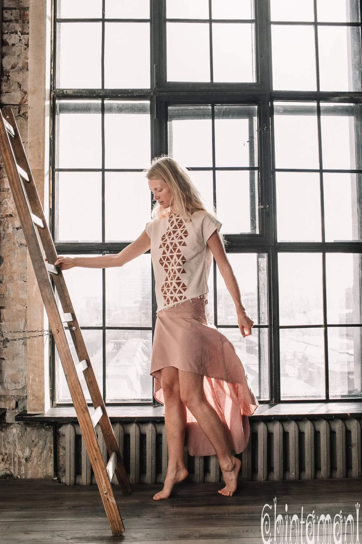 Simple, yet very original raw cotton asymmetrical dusty pink midi skirt with our signature asymmetric silhouette. Short on the front and long on the back, this model graciously cascades around you, creating very floaty feeling, especially when you move. It is very easy to put on, as it has zipper on the side, which is secured by a button clasp. Raw, flat belt is decorated with Navajo (American Indian) themed embroidery and open edges. This skirt comes in two amazing materials – natural linen and raw cotton, and in different soft colors of our pastel palette. Basic and comfortable, yet gorgeous piece to wear at a festival, on holiday or just as a summer fashion statement. Comes in 4 colors: black, cream off white, dusty pink and silvergrey.