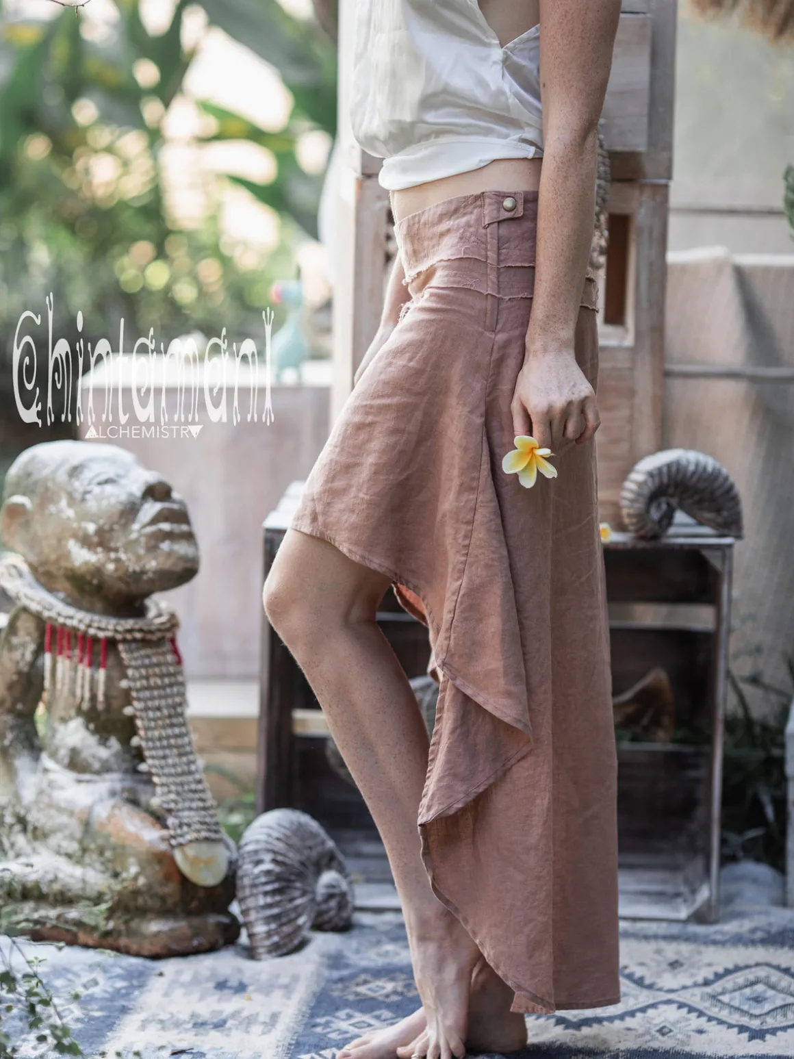 Simple, yet very original dusty pink boho linen skirt with our signature asymmetric silhouette. Short on the front and long on the back, this model graciously cascades around you, creating very floaty feeling, especially when you move. It is very easy to put on, as it has zipper on the side, which is secured by a button clasp. Raw, flat belt is decorated with Navajo (American Indian) themed embroidery and open edges. This skirt comes in two amazing materials – natural linen and raw cotton, and in different soft colors of our pastel palette. Basic and comfortable, yet gorgeous piece to wear at a festival, on holiday or just as a summer fashion statement.