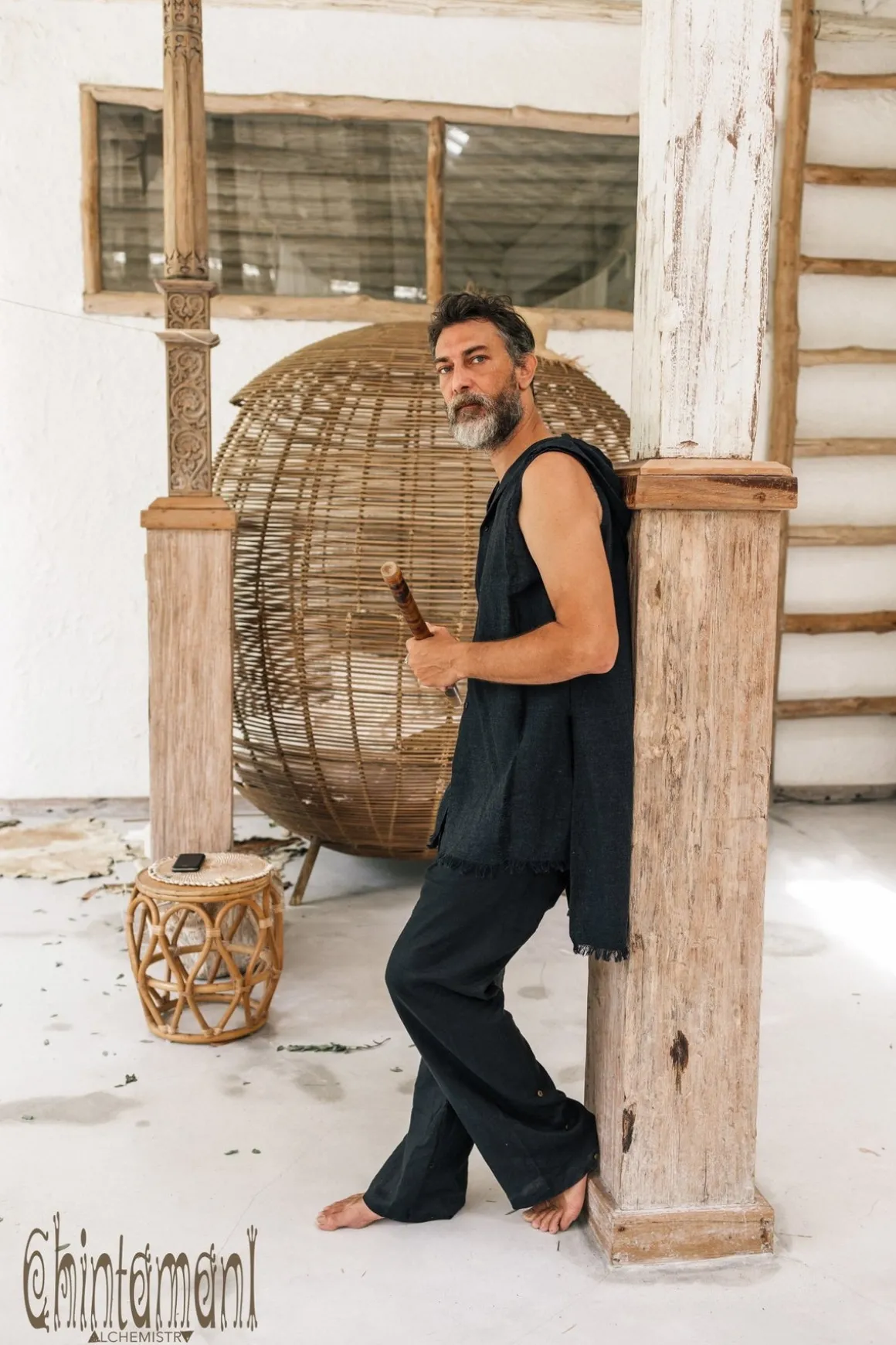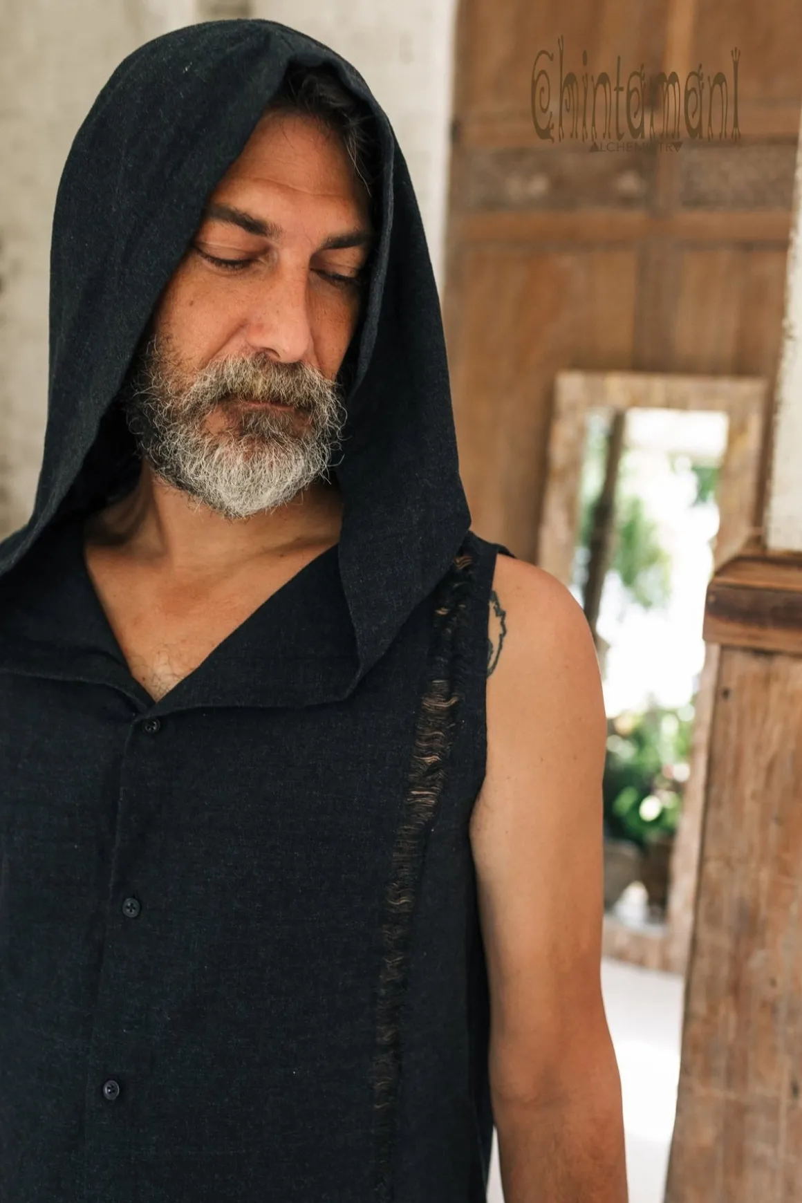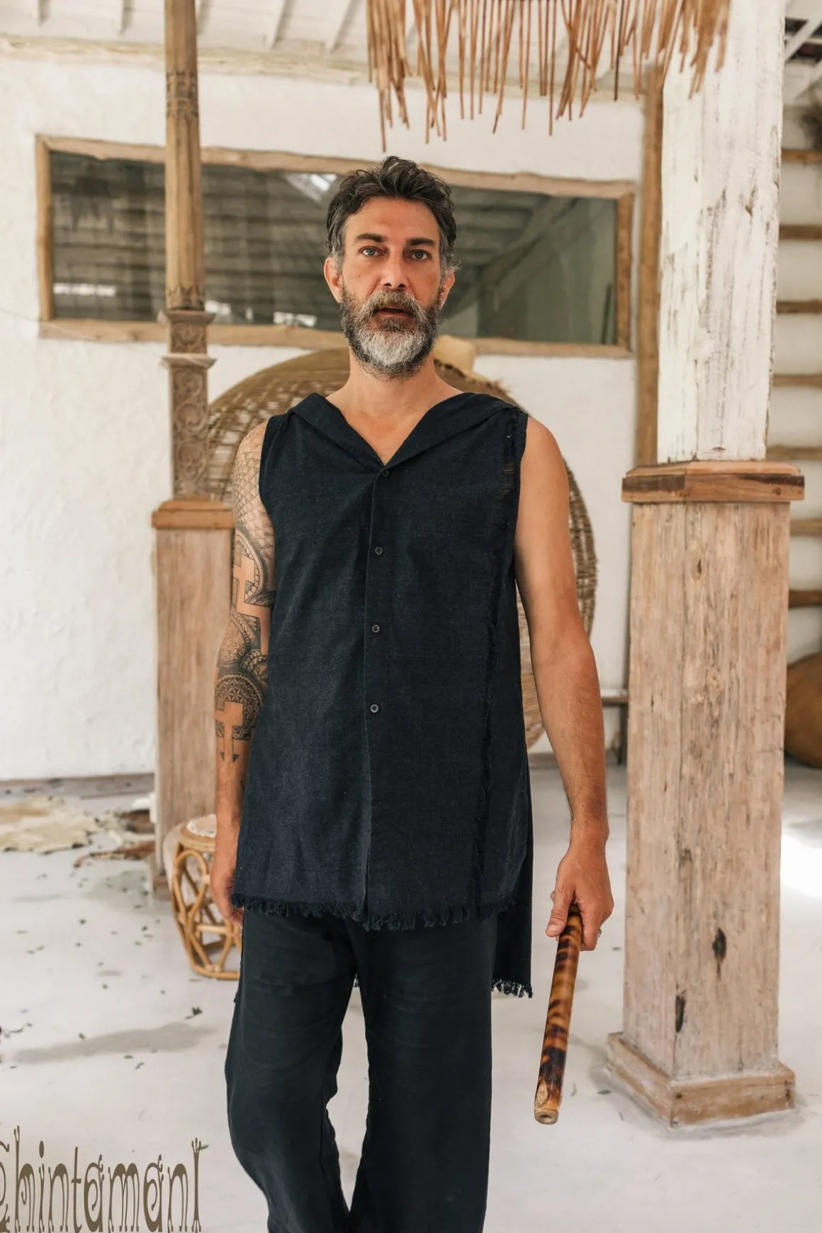 This black long sleeveless vest shirt with a huge hood and geometrical hand print is a very bohemian, yet classy piece from our raw cotton collection. It is made out of 100% cotton – very light, soft, breathable fabric, that looks gorgeously natural. In this shirt the beauty of raw fabric is manifested through original design. Hemline is open, front and back are asymmetrically decorated with long handmade rips; soft huge hood creates very cozy feeling. We make this model in 3 colors – very gently bleached delicate off-white, dusty sage green and classic black. It is a very universal piece – perfect for a sunny summer day, it can serve as a designer top for concerts or artistic events. Long sleeveless shirt will look amazing with our soft Linen pants.