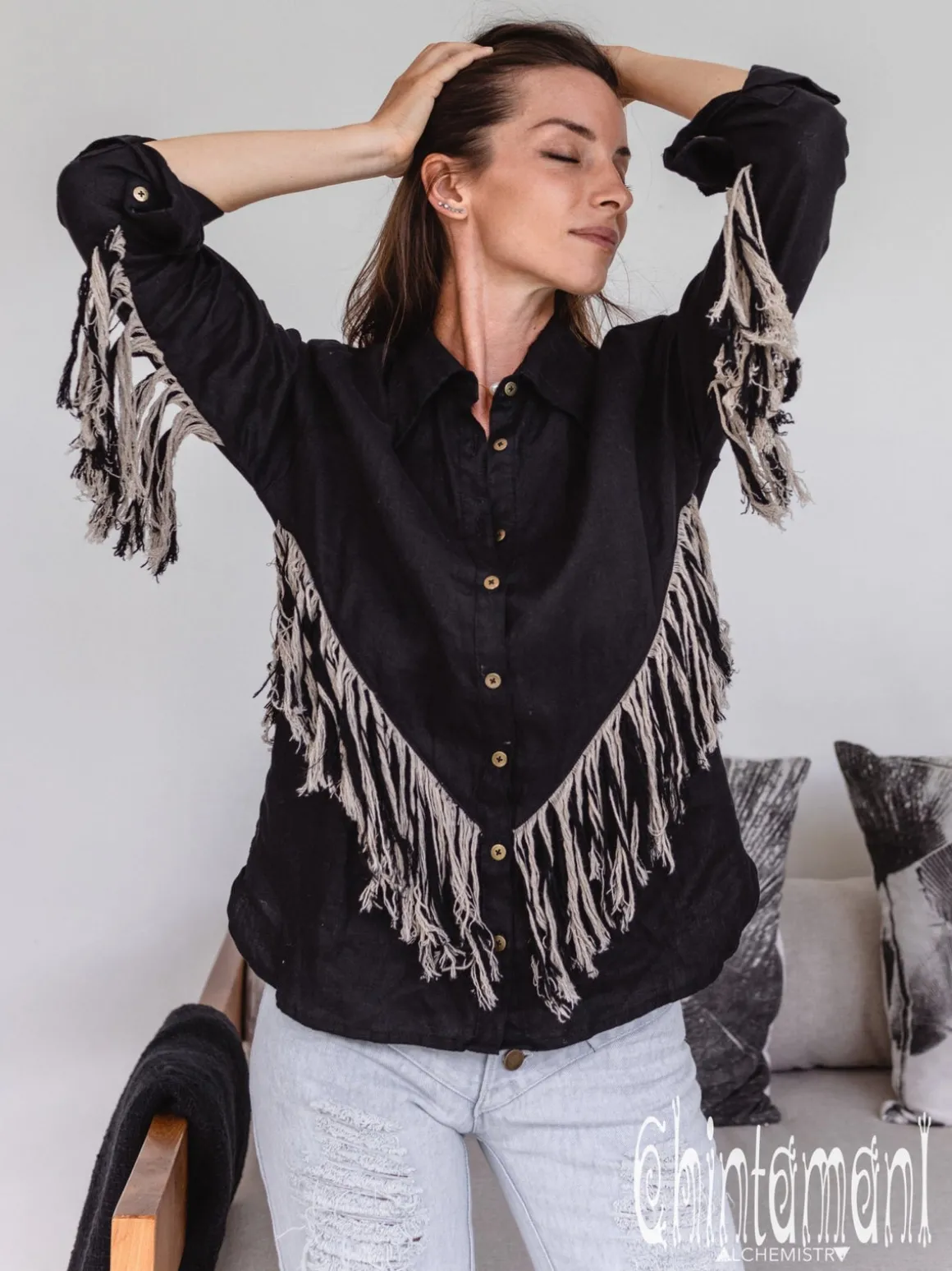 Alma Libra shirt is a classic loose blouse with a very unusual decorative element – long linen fringe that looks cowboy, bohemian and elegant at the same time. The fringe can be found both on the front and back, as well, as under the sleeves, so when you raise your hands it forms plumagelike line. The shirt itself is made of very soft special linen that feels amazing on your skin. Long sleeves give complete protection from sunshine or evening chill, and natural breathable material will ensure your maximal comfort when you wear it. This shirt combines amazingly with jeans and high boots, but also can be worn open on top of jumpsuits for sunshine protection and additional kaftan-like layer. You can have our Alma Libra shirt in three colors – soft white, masculine black or tender and feminine dusty pink: