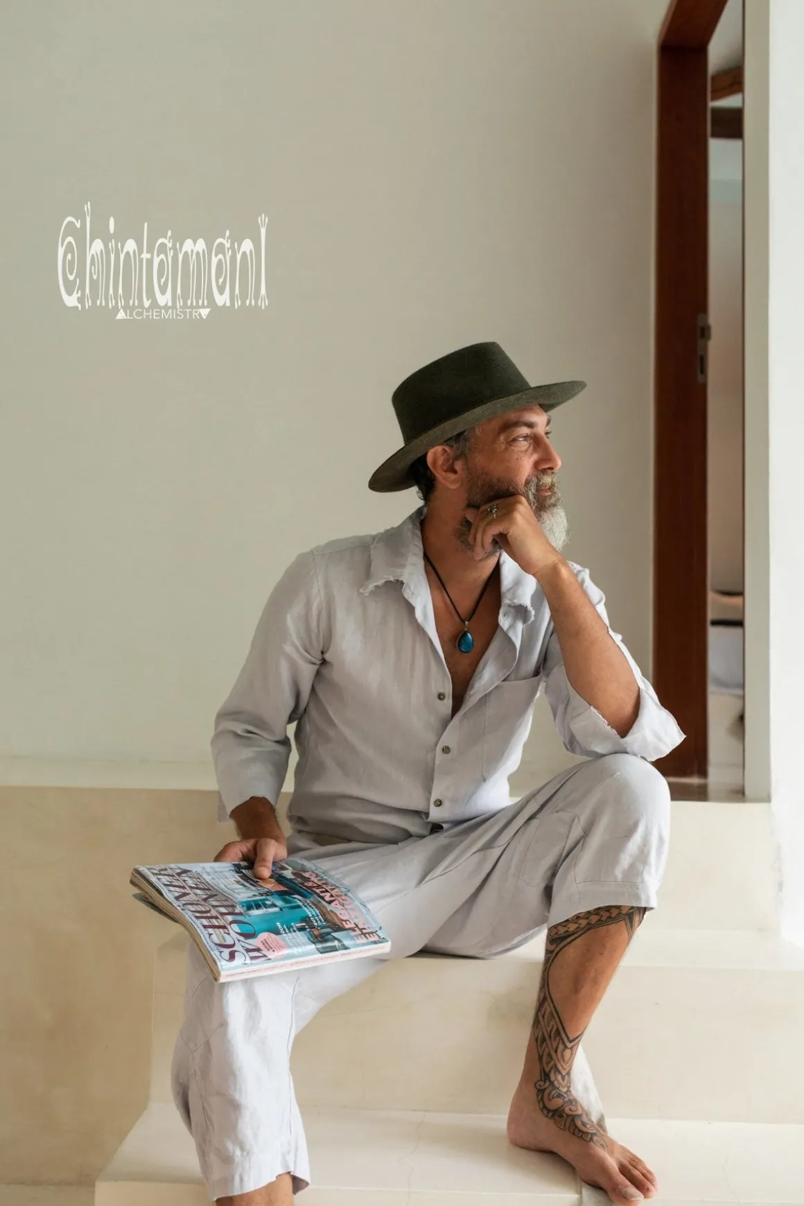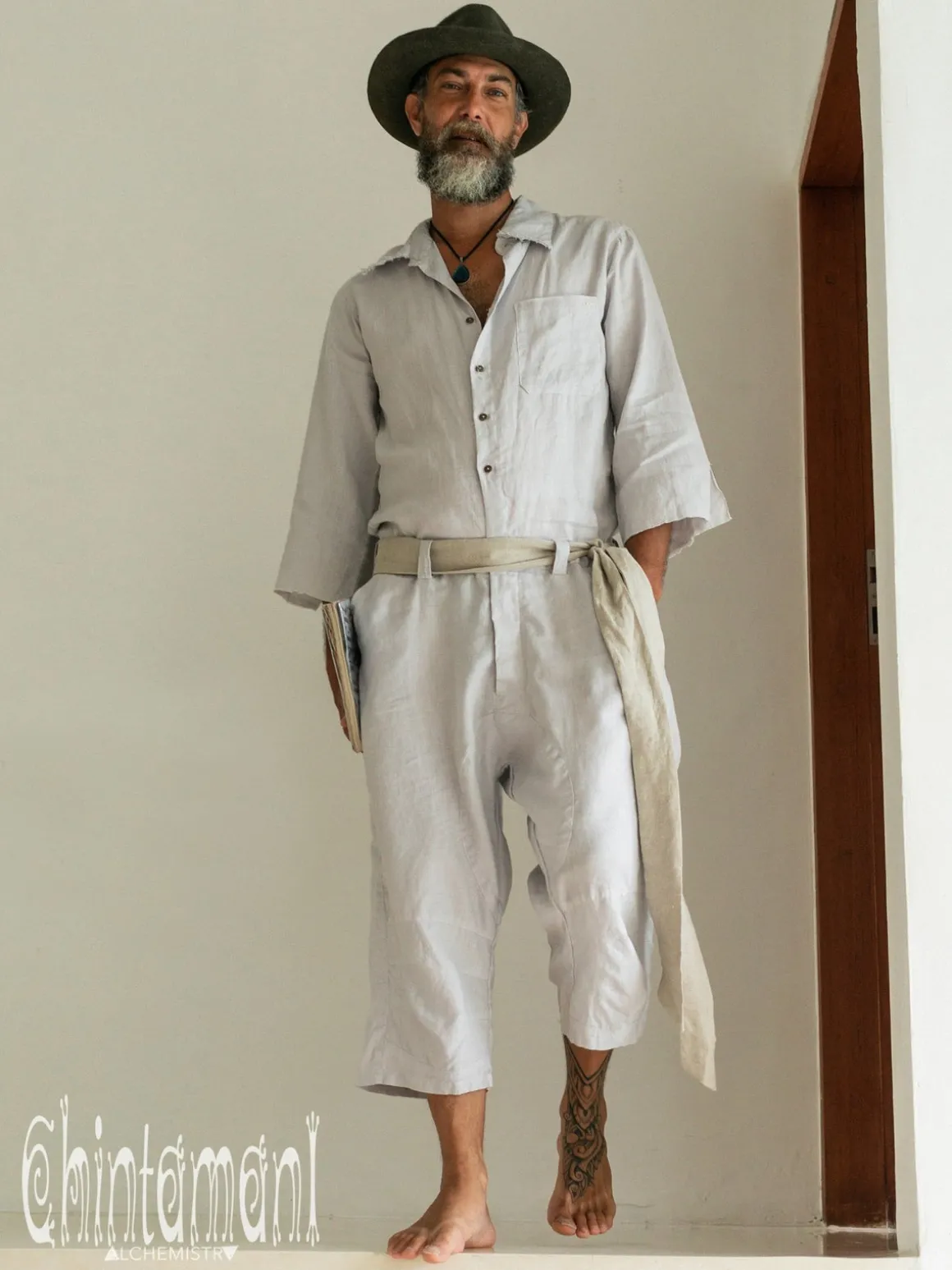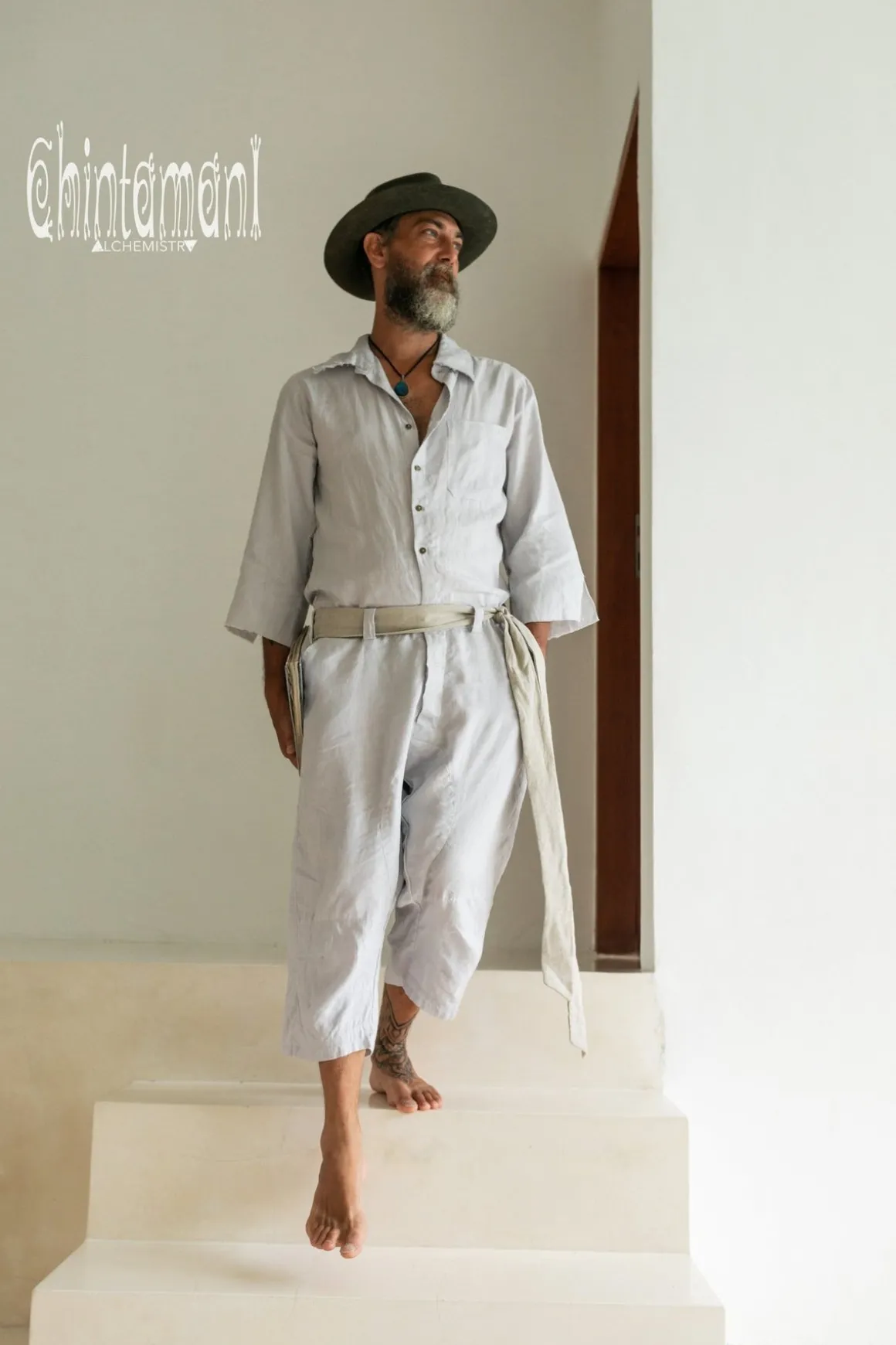This is a fashion statement we were working on for years. An elegant and cozy boiler suit for men with the perfect silhouette is finally here! 3/4 sleeves, and calf length trousers will even fit tall stature. Not too tight, and not too loose, this design compliments any type of figure. Our amazing new piece is made of 100% natural linen fabric which is antibacterial and breathable, so you can easily wear this romper without any underwear. It combines nicely with boots or just flip flops to feel just right even in the hot summer. This model comes in light gray color and can be shaped by gray linen belt. More color combinations are coming soon! Rock your summer nice and easy in this wholesome piece!