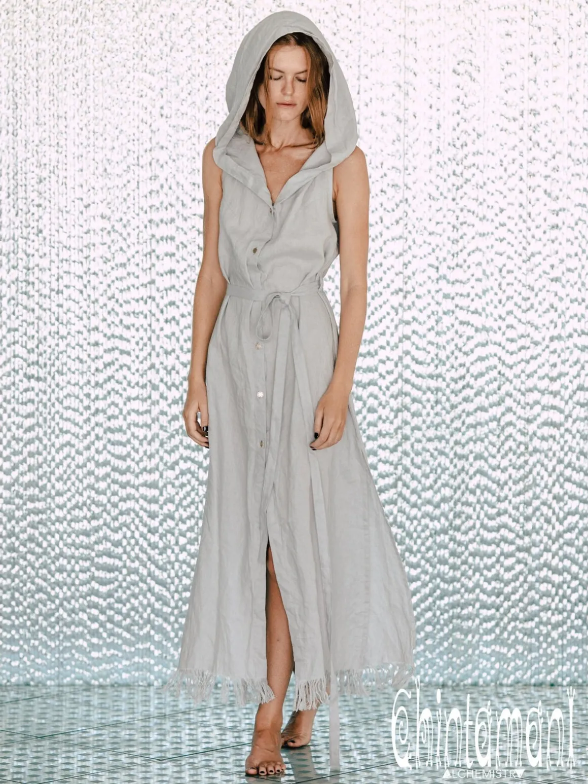 Gorgeous Grey Linen Dress is an elegant bohemian creation made from natural linen with attention to every detail. Its main feature is a huge, soft hood, that looks very romantic and medieval. Handmade fringe on the hemline add to the artsy look. Meanwhile very classy shirt cut, little belt with a buckle on the back and raw, noble texture of 100% linen turn this model into casually elegant masterpiece. Deep side cuts, that open only if you start moving around, is a little sensual, very feminine accent. Buttons for this model are specially made in our jewelry workshop in Bali in form of our signature flower of life geometrical pattern. This is a unique work of art from Chintamani Alchemistry new pure natural collection!