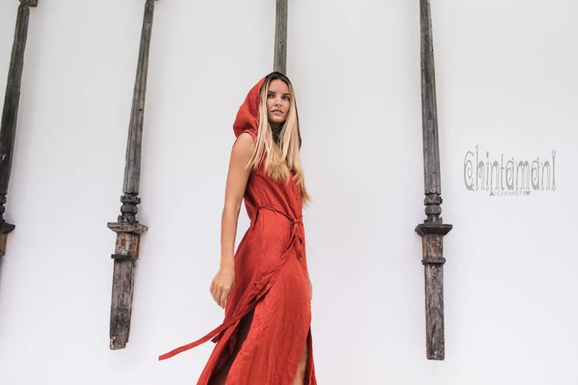Gorgeous Hooded Red Ochre Linen Dress is an elegant bohemian creation made from natural linen with attention to every detail. Its main feature is a huge, soft hood, that looks very romantic and medieval. Handmade fringe on the hemline add to the artsy look. Meanwhile very classy shirt cut, little belt with a buckle on the back and raw, noble texture of 100% linen turn this model into casually elegant masterpiece. Deep side cuts, that open only if you start moving around, is a little sensual, very feminine accent. Buttons for this model are specially made in our jewelry workshop in Bali in form of our signature flower of life geometrical pattern. This is a unique work of art from Chintamani Alchemistry new pure natural collection!