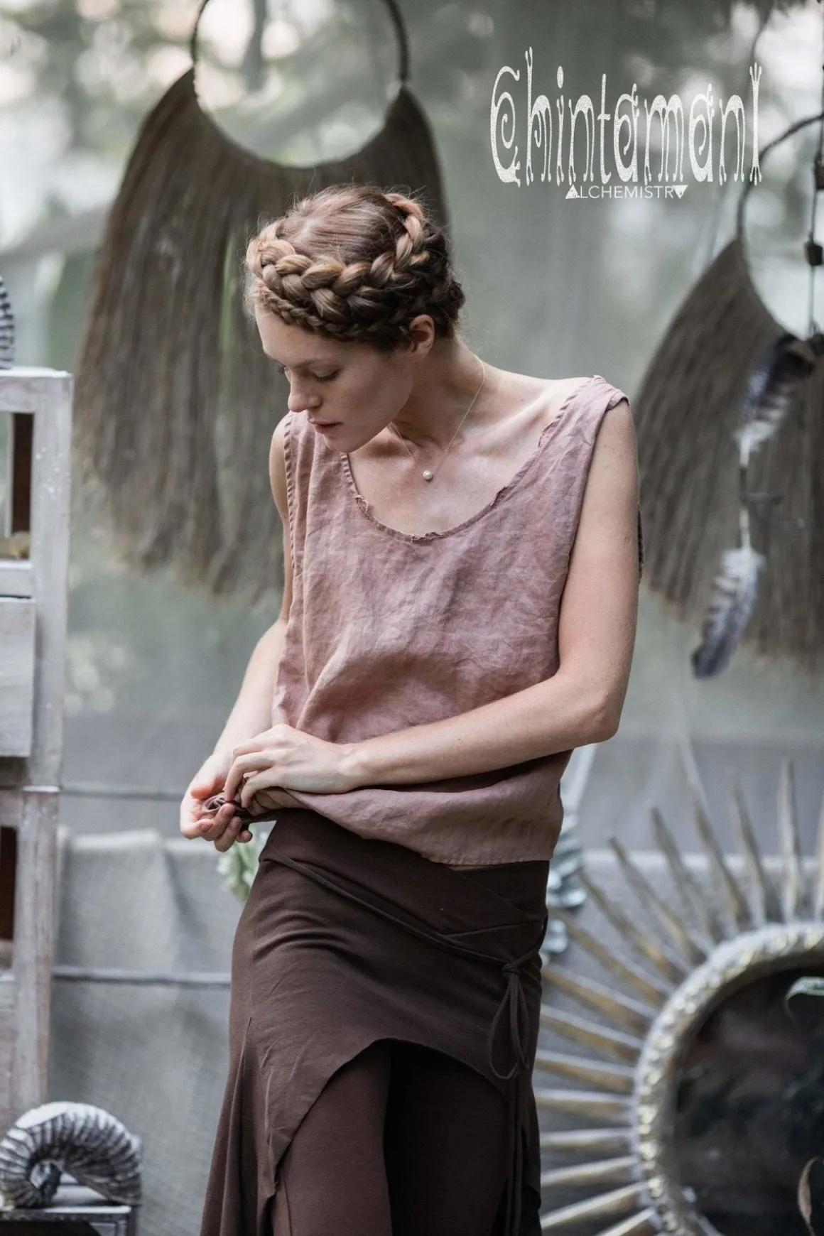 Dusty Pink Linen Top is a simple and gorgeous item, a combination of classy look, natural feel and ultimate comfort. It is made of pure linen, amazing material, that spoil your skin with its light airness. The unique design of this crop top is wonderfully versatile – you can wear it as a long loose tunic with asymmetric hemline, but then, using a slit on the side you can tie two edges and convert your top into waist length bodice. Noble dusty pink, silver grey or classic white and black color of Linen Tunic Top upgrades its minimalistic and rustic appearance to aristocratic simplicity. This top looks stunningly beautiful with our wide linen pants, and will create an artsy casual ensemble with our gypsy bohemian skirts and distressed jeans.