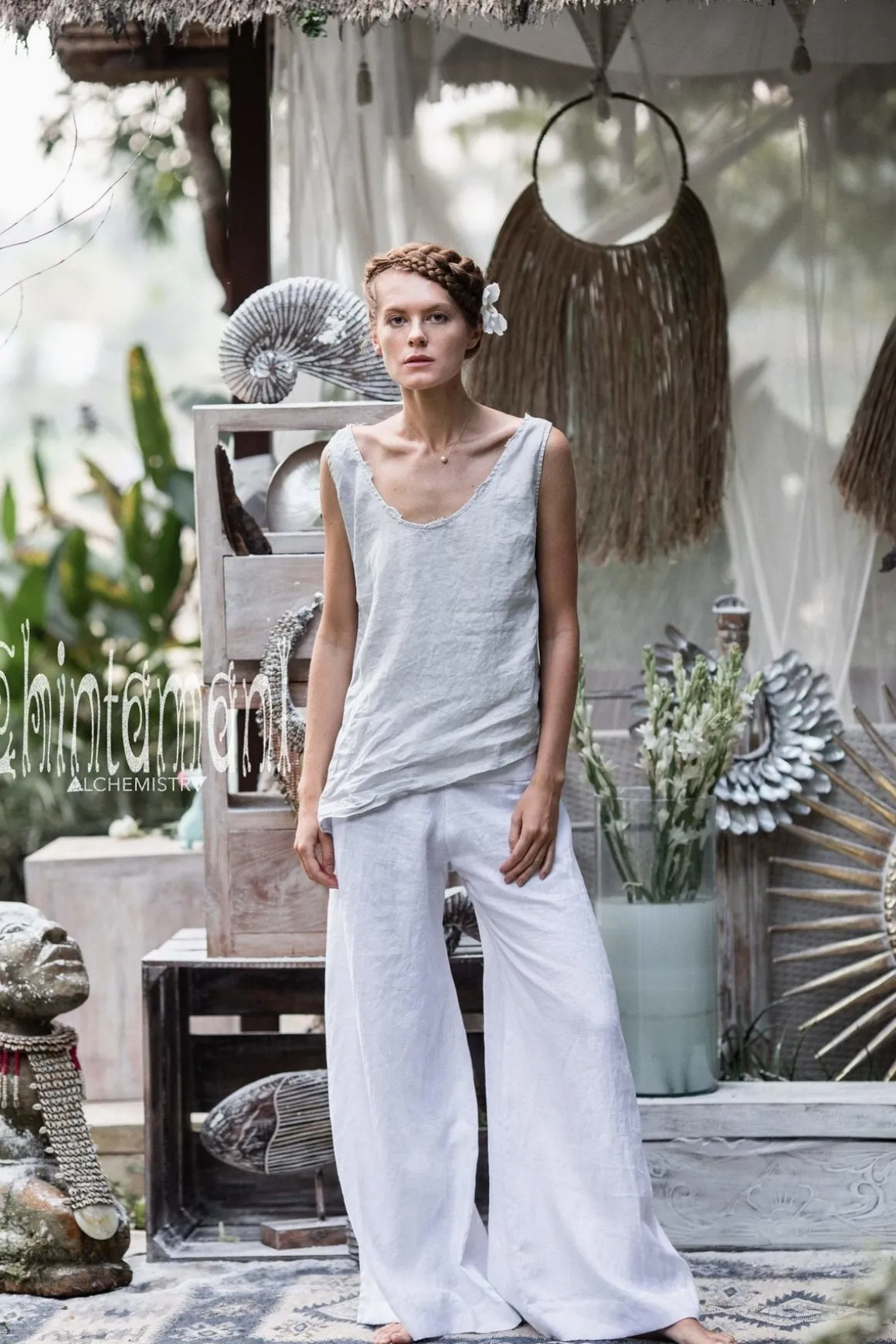 Grey Linen Top is a simple and gorgeous item, a combination of classy look, natural feel and ultimate comfort. It is made of pure linen, amazing material, that spoil your skin with its light airness. The unique design of this boho top is wonderfully versatile – you can wear it as a long loose tunic with asymmetric hemline, but then, using a slit on the side you can tie two edges and convert your top into waist length bodice. Noble dusty pink, silver grey or classic white and black color of Linen Tunic Top upgrades its minimalistic and rustic appearance to aristocratic simplicity. This top looks stunningly beautiful with our wide linen pants, and will create an artsy casual ensemble with our gypsy bohemian skirts and distressed jeans.
