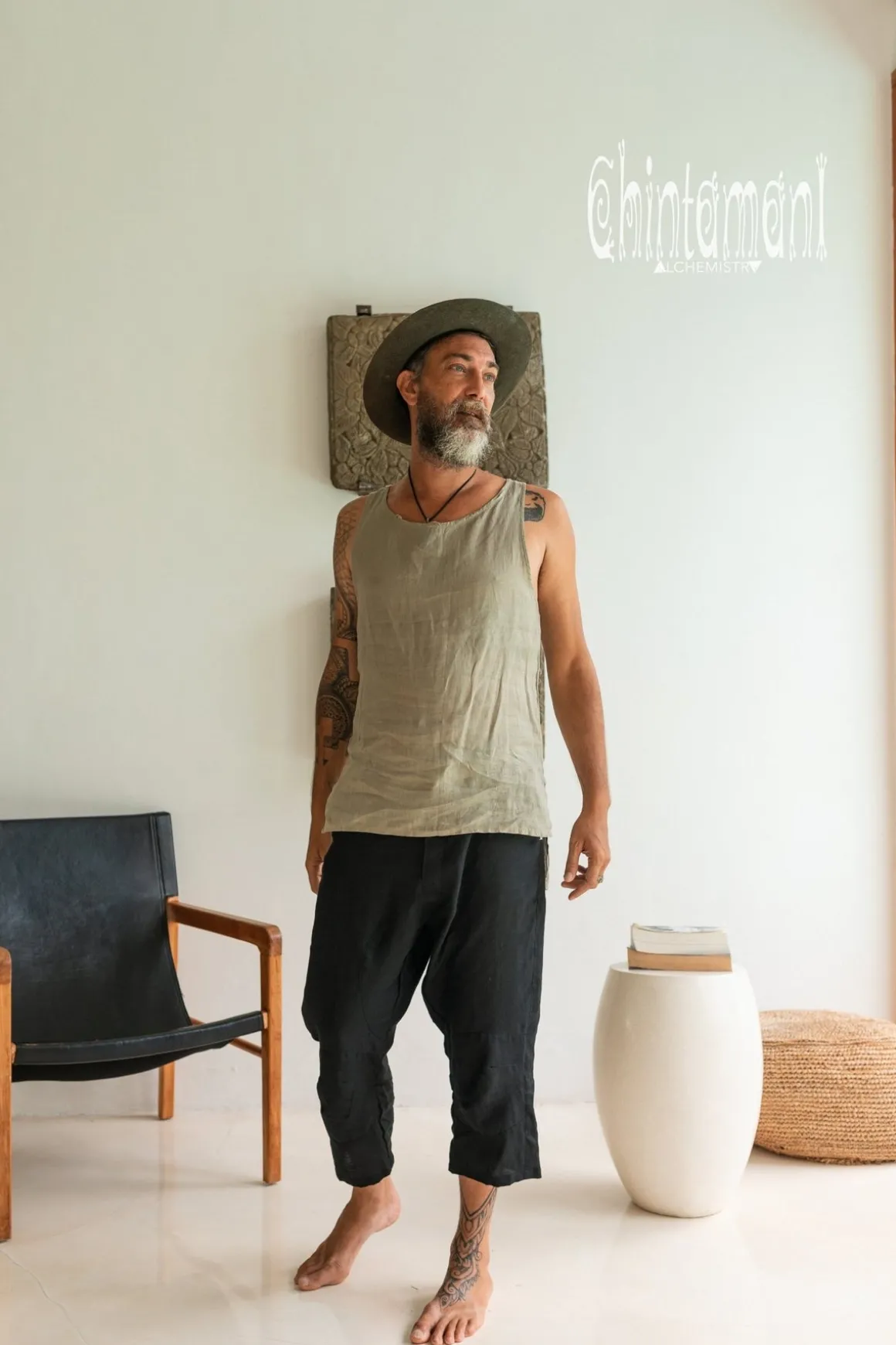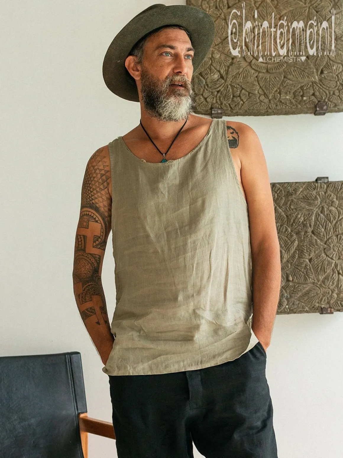 Simple basic sage green men’s top made out of soft natural linen. Sleeveless cut shows off hands and shoulders, meanwhile airy silhouette, a bit longer on the back, creates artsy bohemian look. This garment made of 100% natural fabric feels especially good in hot weather. We recommend to buy one size bigger for loose, comfortable fit. It will go amazing with long light-colored trousers or something ethnic, like Thai fisherman pants or even sarong. Our basic linen top comes in 4 colors – classic black, raw grey (the color of unbleached fabric), red ochre or sophisticated pink.
