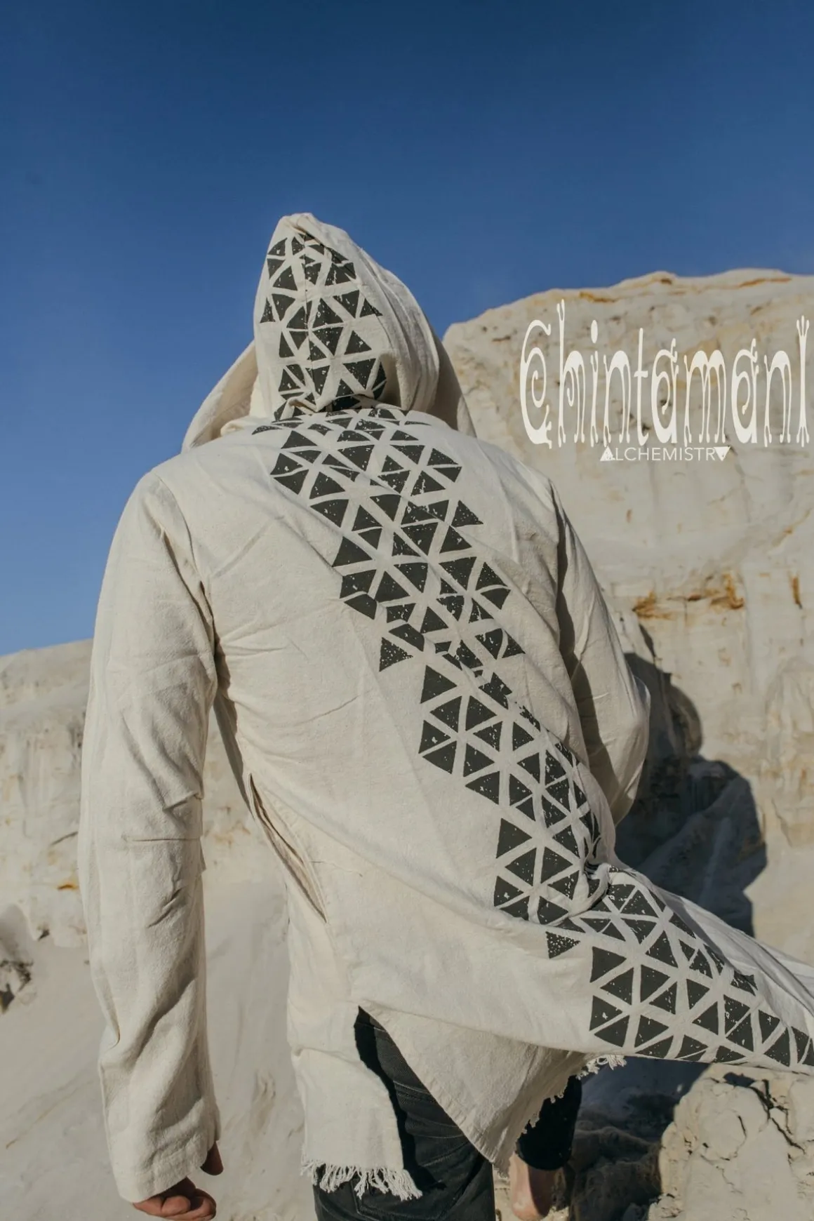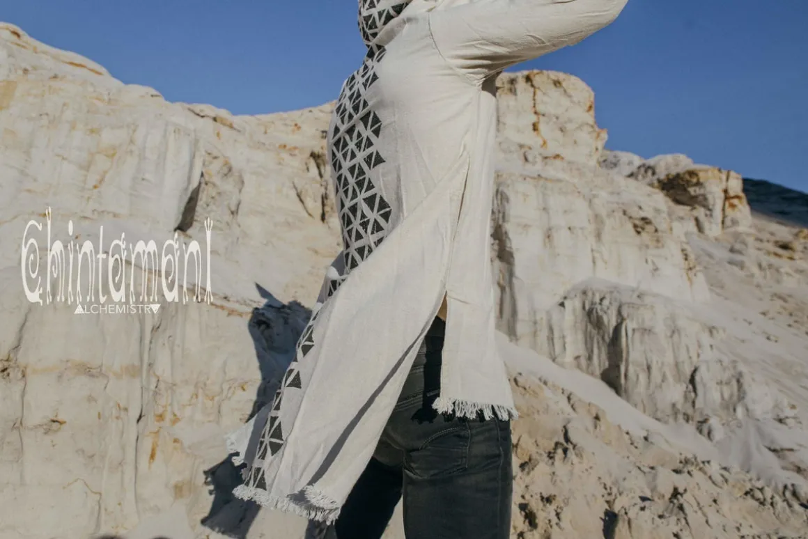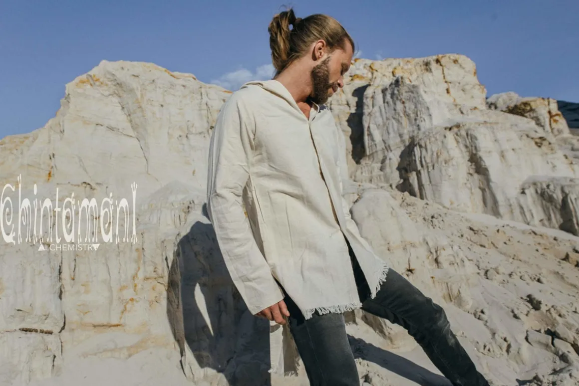 This off white hooded shirt for men is a very comfortable piece to wear with jeans or pants in a cooler climate. It has big pilgrim hood, extra long sleeves for coziness and even side pockets! The back is decorated with geometric “worn out” screen printed patterns, to add some artsy twist to this simple and classic model. The hemline is open, so that this piece will combine perfectly with any of your boho wardrobe, be it ethnic trousers, distressed jeans or our beautiful soft Linen pants. Hoody shirt comes in two classic colors – black and white.