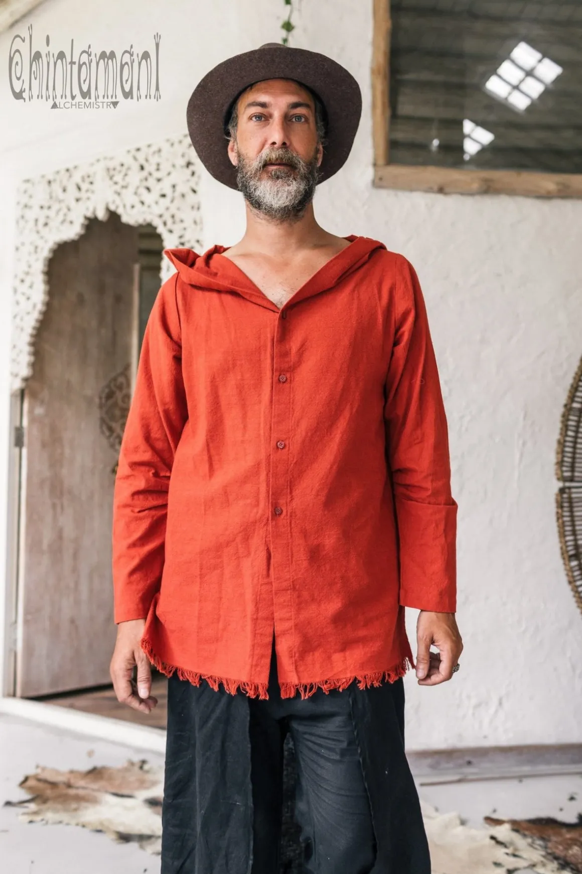 This red ochre hooded shirt for men is a very comfortable piece to wear with jeans or pants in a cooler climate. It has big pilgrim hood, extra long sleeves for coziness and even side pockets! The back is decorated with geometric “worn out” screen printed patterns, to add some artsy twist to this simple and classic model. The hemline is open, so that this piece will combine perfectly with any of your boho wardrobe, be it ethnic trousers, distressed jeans or our beautiful soft Linen pants. Hoody shirt comes in two classic colors – black and white.